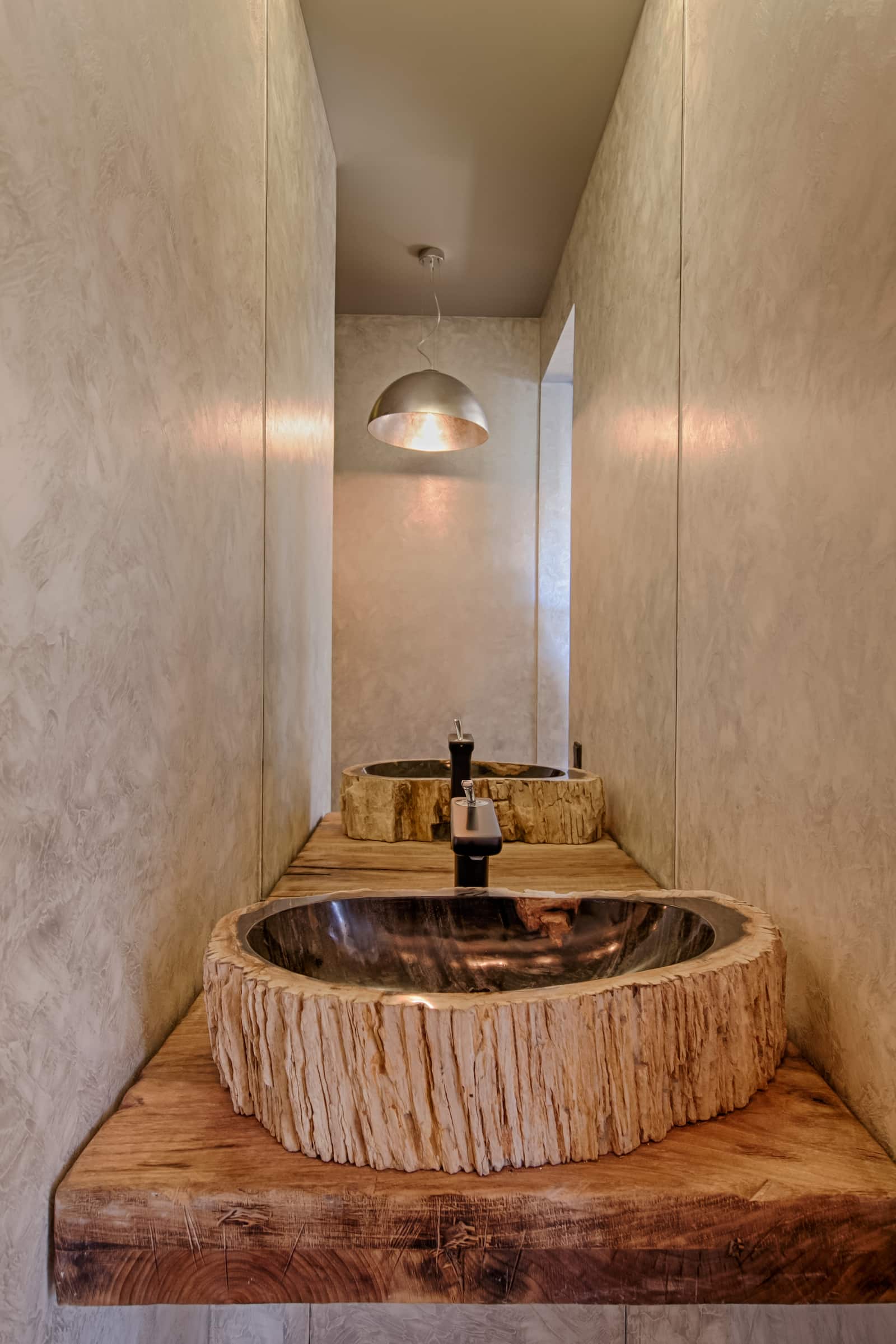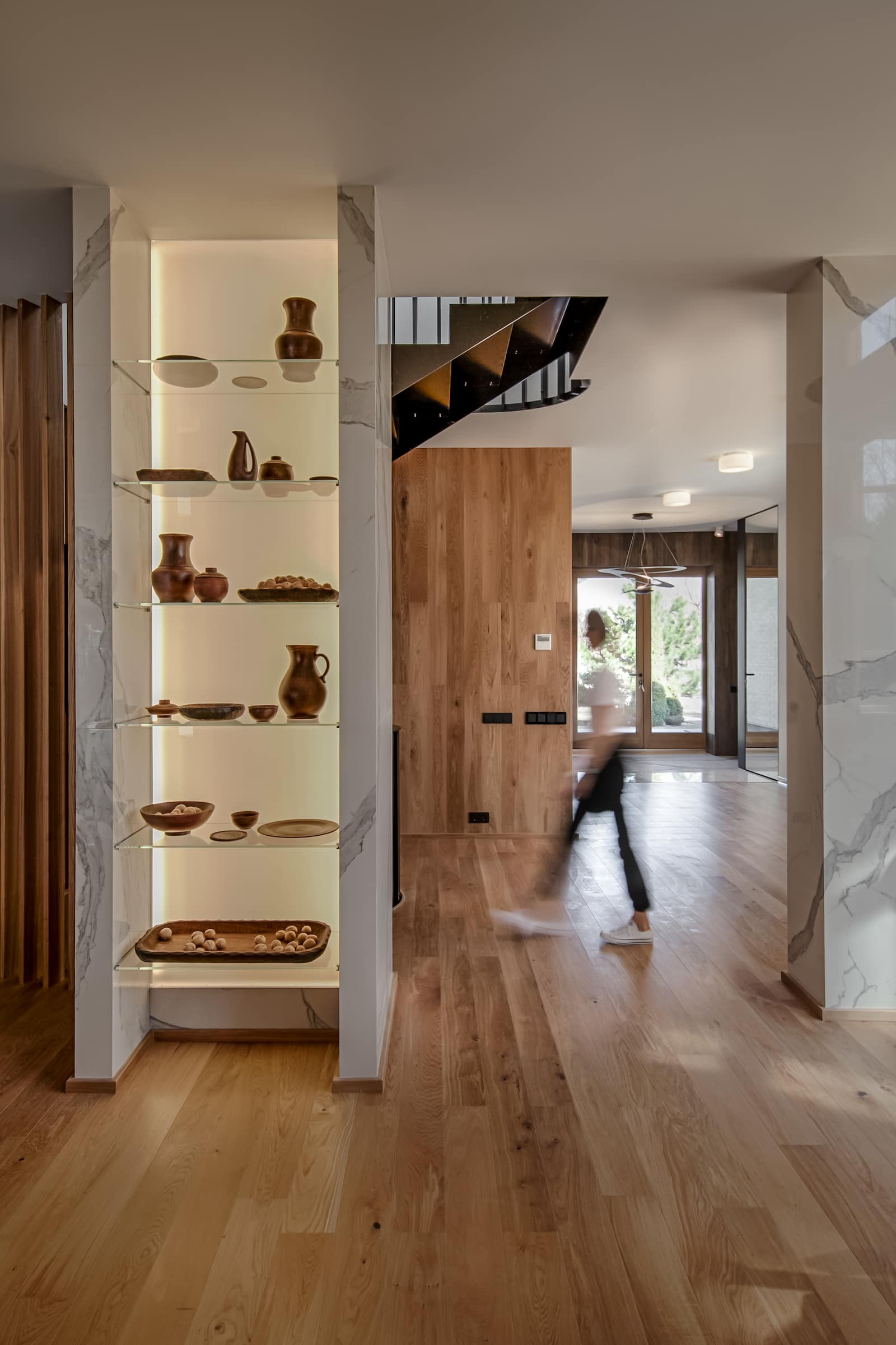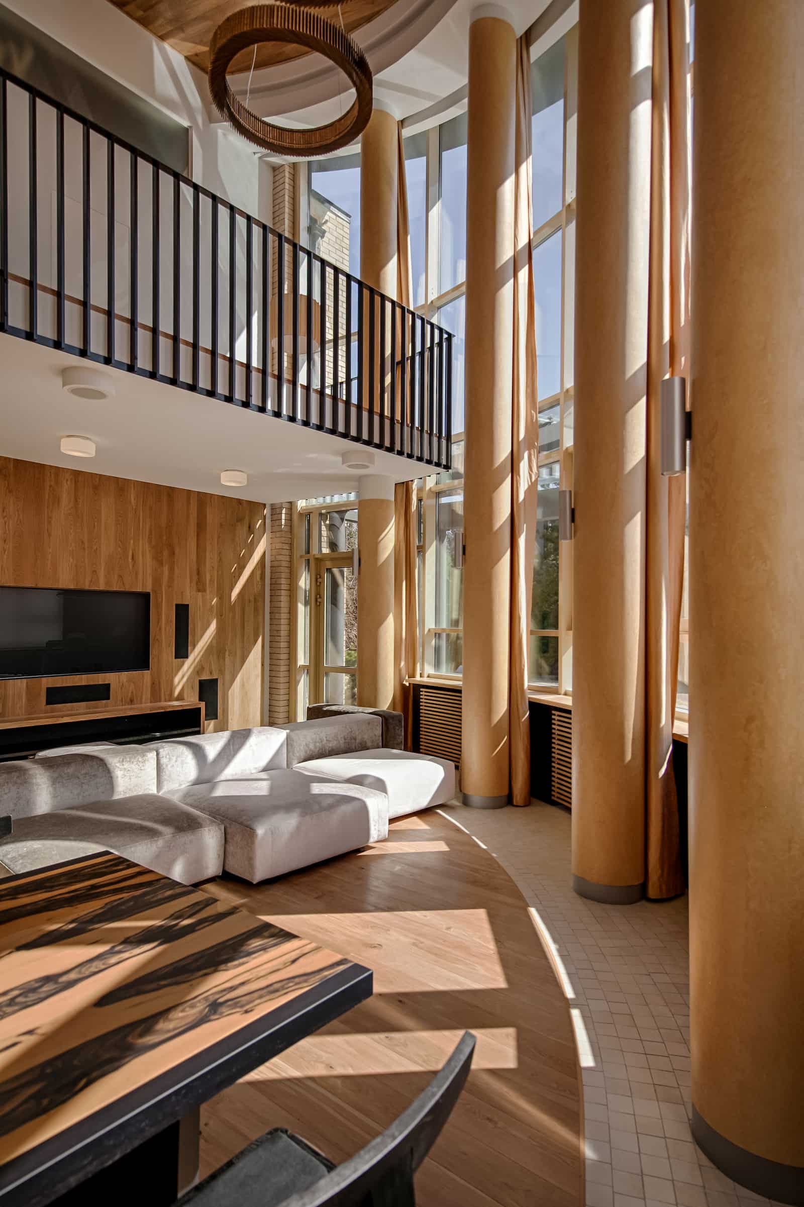 Тонкие колонны, вытянутые во всю высоту двух этажей, — то немногое, что осталось от старого интерьера. Обшитые ценным кленовым шпоном, они вписались в новую эко-концепцию и выглядят гармонично рядом с деревянными кольцами и «желудями» подвесных светильников. Объем несущего столба в зоне столовой и превратился в буфет-витрину с где выставлена глиняная посуда крымских ремесленников, а также деревянные блюда, которые сделал своими руками отец хозяина дома: резьба по дереву — его хобби.