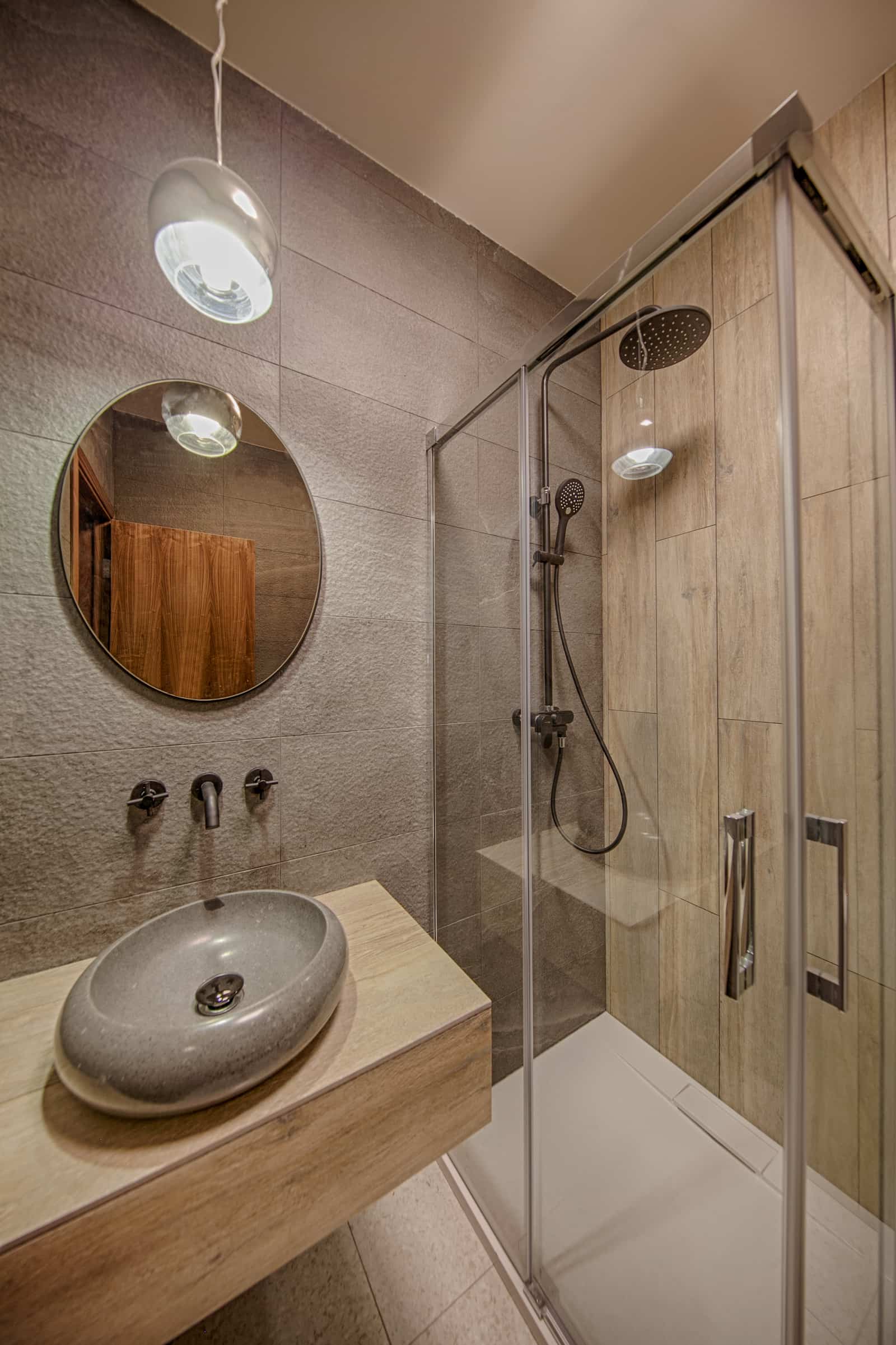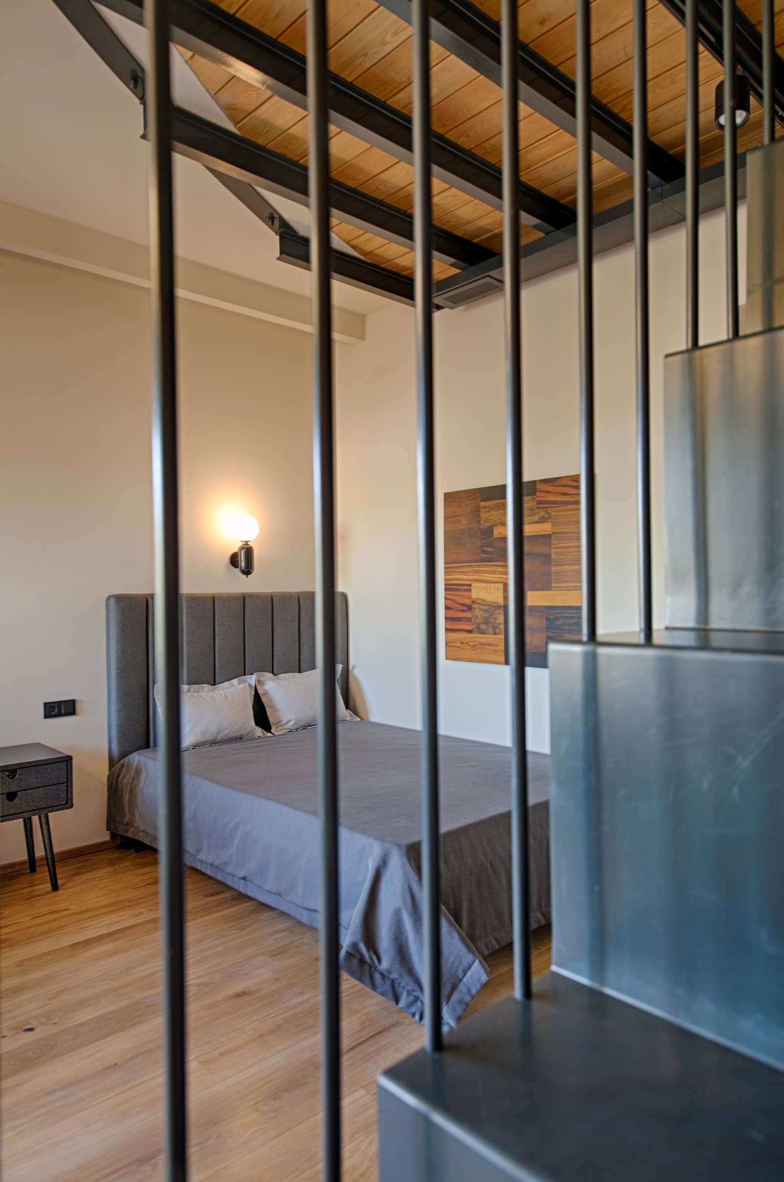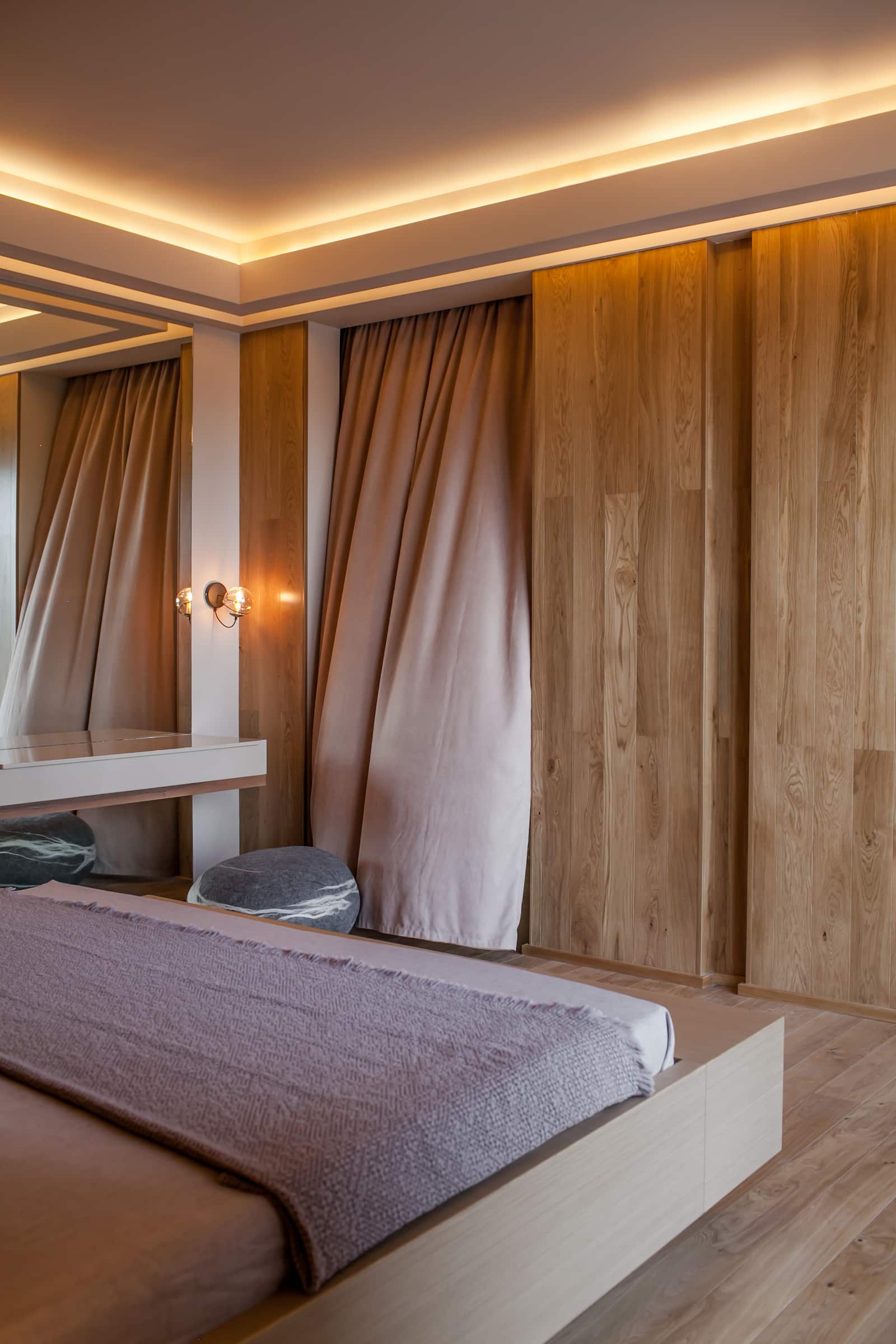 Тонкие колонны, вытянутые во всю высоту двух этажей, — то немногое, что осталось от старого интерьера. Обшитые ценным кленовым шпоном, они вписались в новую эко-концепцию и выглядят гармонично рядом с деревянными кольцами и «желудями» подвесных светильников. Объем несущего столба в зоне столовой и превратился в буфет-витрину с где выставлена глиняная посуда крымских ремесленников, а также деревянные блюда, которые сделал своими руками отец хозяина дома: резьба по дереву — его хобби.