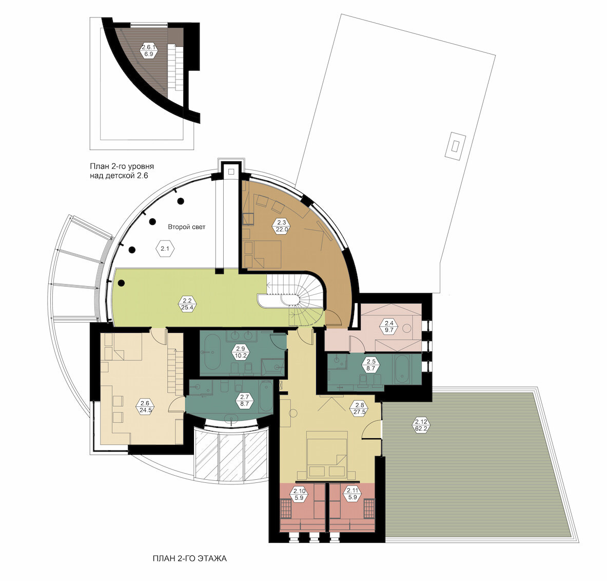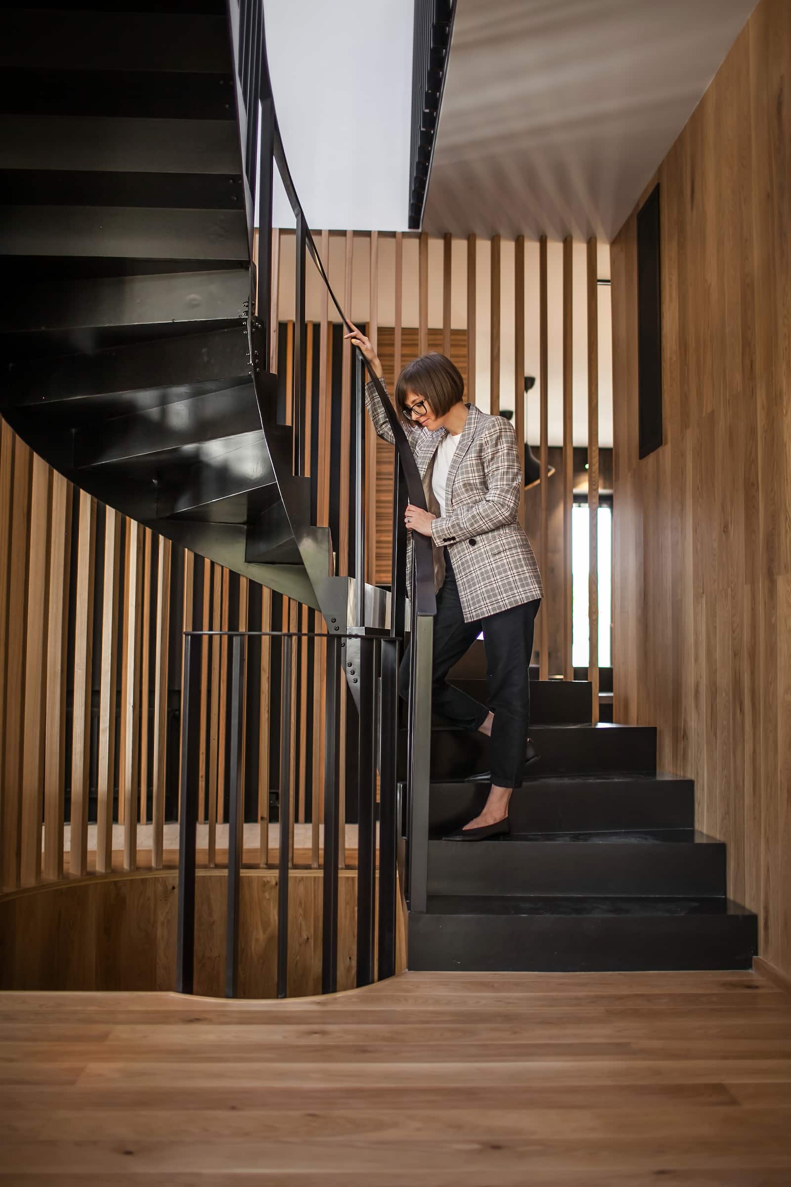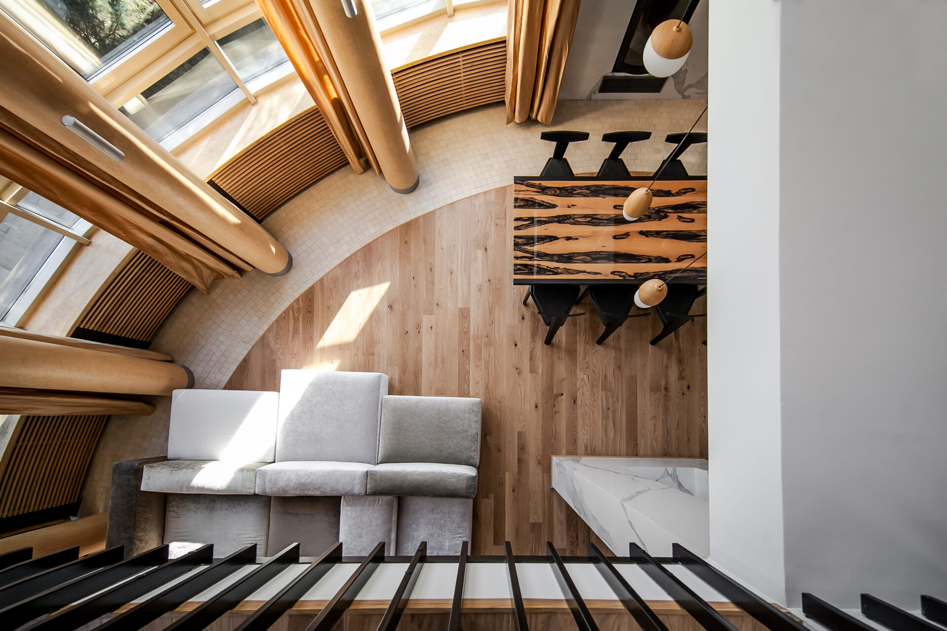 Архитектура дома необычна: круглый основной объем, изогнутый фасад. Кардинально менять ее не собирались — важно было сделать здание более удобным, функциональным, современным внутри и снаружи. «Внешне эффектное архитектурное решение имело свои недостатки. Их предстояло исправить, изменив внутреннюю планировку. Мы полностью переделали лестницу и второй этаж, который вместил три автономные спальни, со своими гардеробными комнатами и санузлами — в первоначальной планировке этого было.