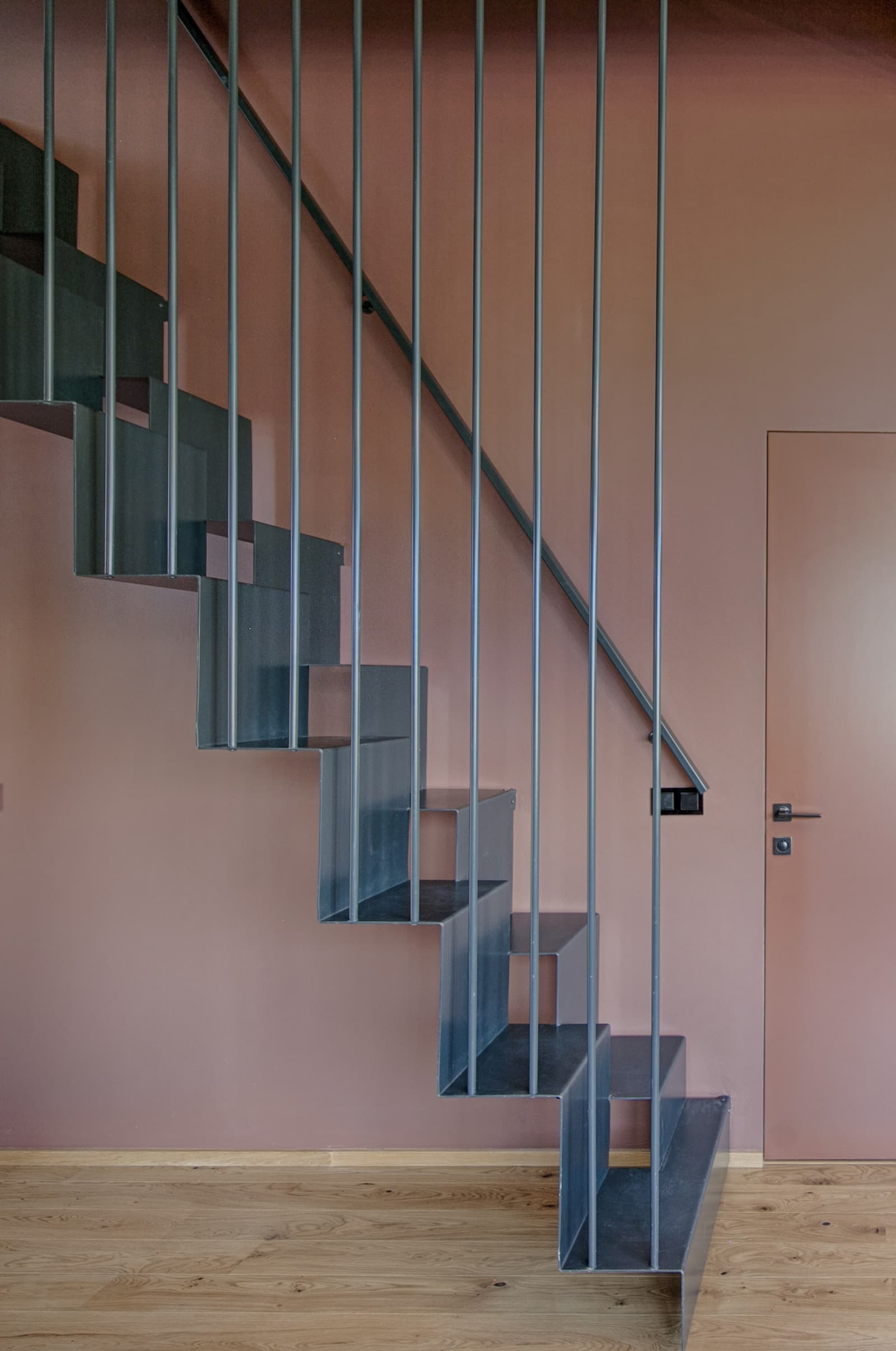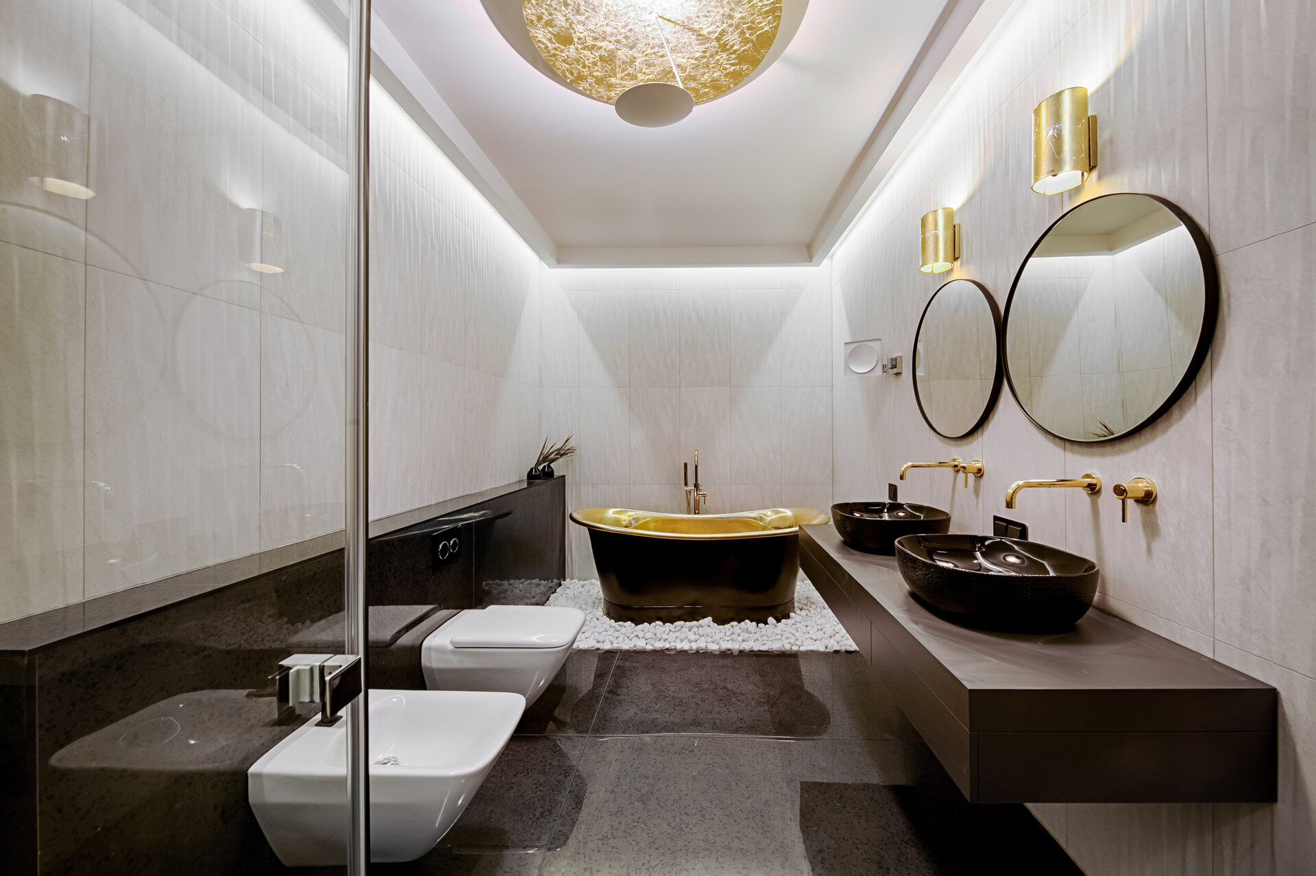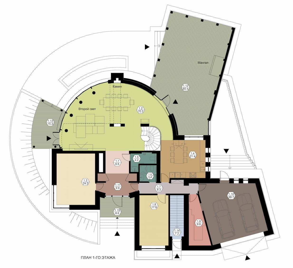 Архитектура дома необычна: круглый основной объем, изогнутый фасад. Кардинально менять ее не собирались — важно было сделать здание более удобным, функциональным, современным внутри и снаружи. «Внешне эффектное архитектурное решение имело свои недостатки. Их предстояло исправить, изменив внутреннюю планировку. Мы полностью переделали лестницу и второй этаж, который вместил три автономные спальни, со своими гардеробными комнатами и санузлами — в первоначальной планировке этого было.