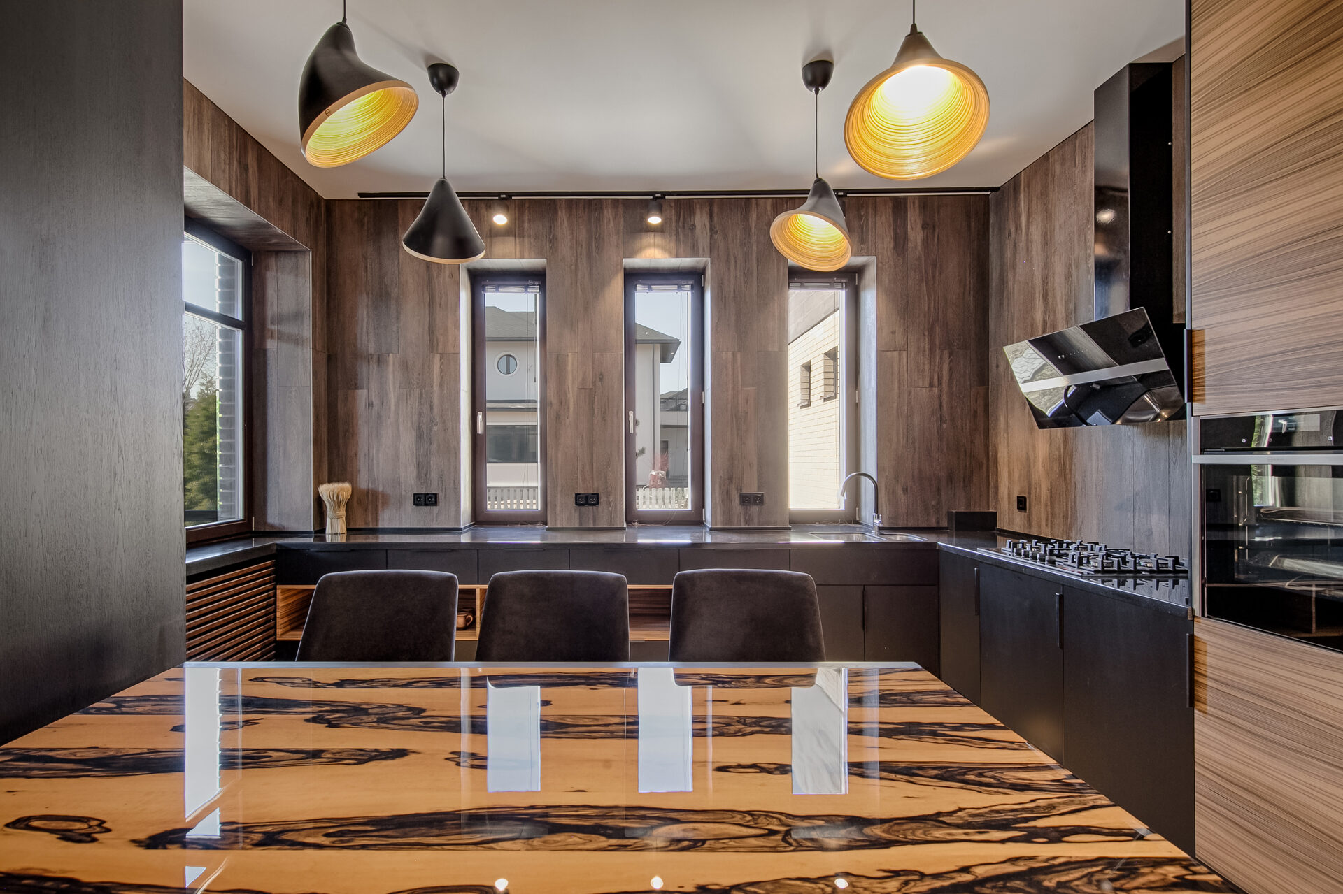 При выборе стиля, мы взяли за основу скандинавские лаконичные интерьеры, с большим количеством дерева и светлыми стенами и добавили элементы шика, а именно природный камень, авторские предметы и аксессуары. В потолок над гостиной отделали светлым дубом, что позволяло эффектно подчеркнуть его конструкцию, крутой наклон и проемы окон в кровле. Этот же материал применили на полу обоих этажей и на стенах, объединив сложную архитектуру дома. В комплект к дубу выбрана фактура классического каррарского мрамора и контрастные черные элементы. Интерьер дома насыщен мебелью, выполненной на заказ специально для дома. Столешницу для обеденных столов собрали из шпона эбенового дерева.