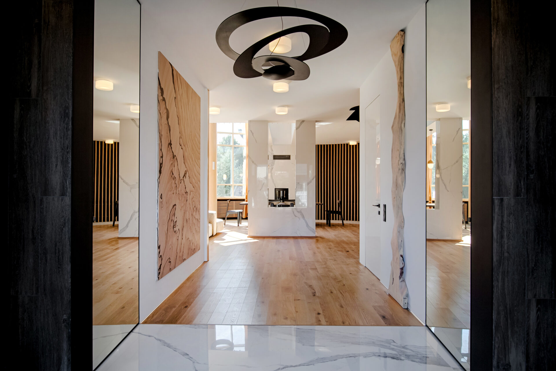 Входную часть переделали кардинально. Вместо узкого темного тамбура создали большой холл с витражной парадной дверью в дубовой раме и панорамным остеклением. Теперь интерьерная история начинается извне — через огромные окна видно внутреннее пространство. Дом расположен в глубине участка, что и позволило применить столь открытое фасадное решение. «Во входной зоне не хватало симметрии и пространственных перспектив. Были снесены стены, которые мешали этому, и выстроили ниши под гардеробные шкафы. Они спрятаны за зеркалами, установленными друг напротив друга под небольшим углом. Такое решение дает интересное двойное отражение, зрительно расширяя пространство.