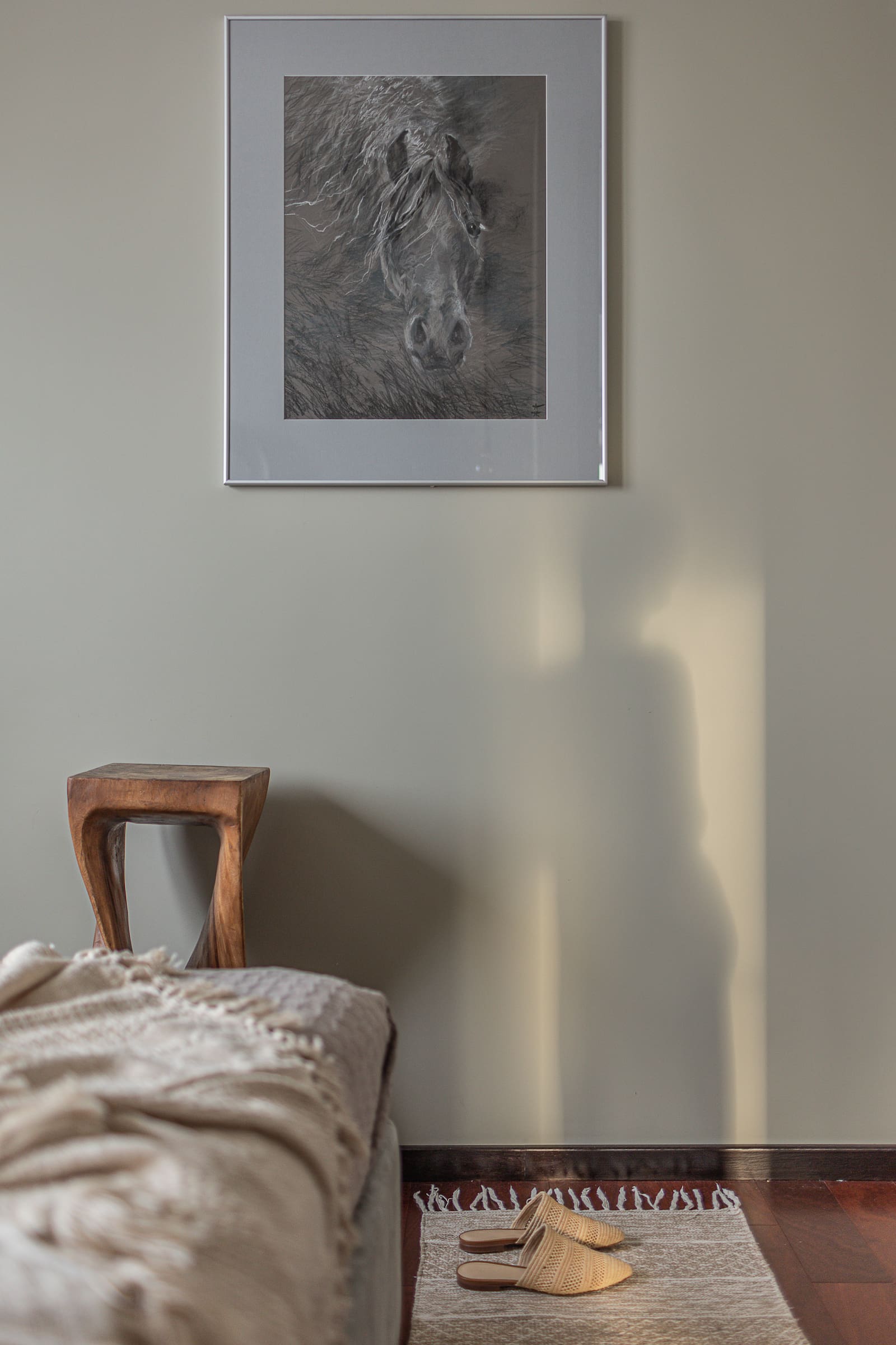 Специально для этого проекта была создана работа под названием «Лошадь», изображающая тотемное животное хозяйки. Эта картина стала не только украшением интерьера, но и символом гармонии и единства с природой, что так важно для создания комфортной атмосферы. Картина «Лошадь» занимает центральное место в интерьере, привлекая внимание и добавляя глубины и смысла всему пространству.