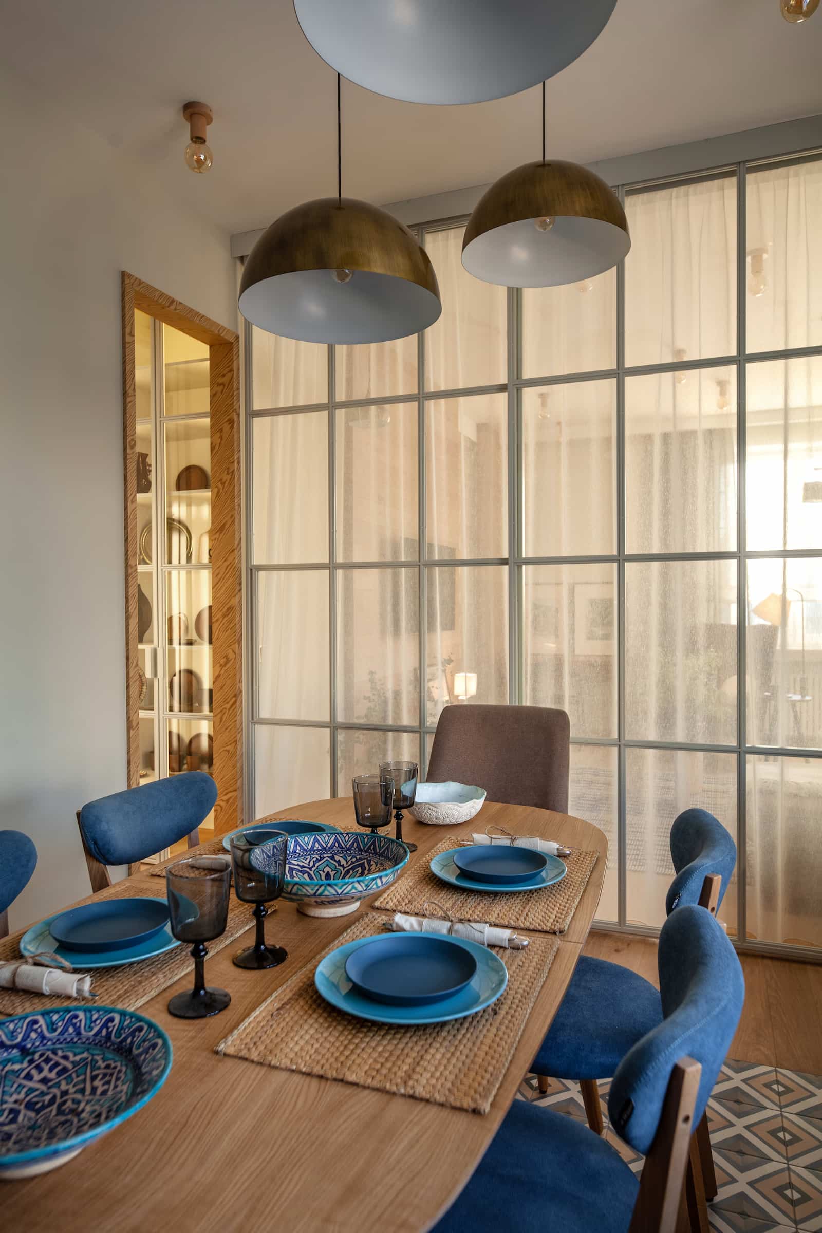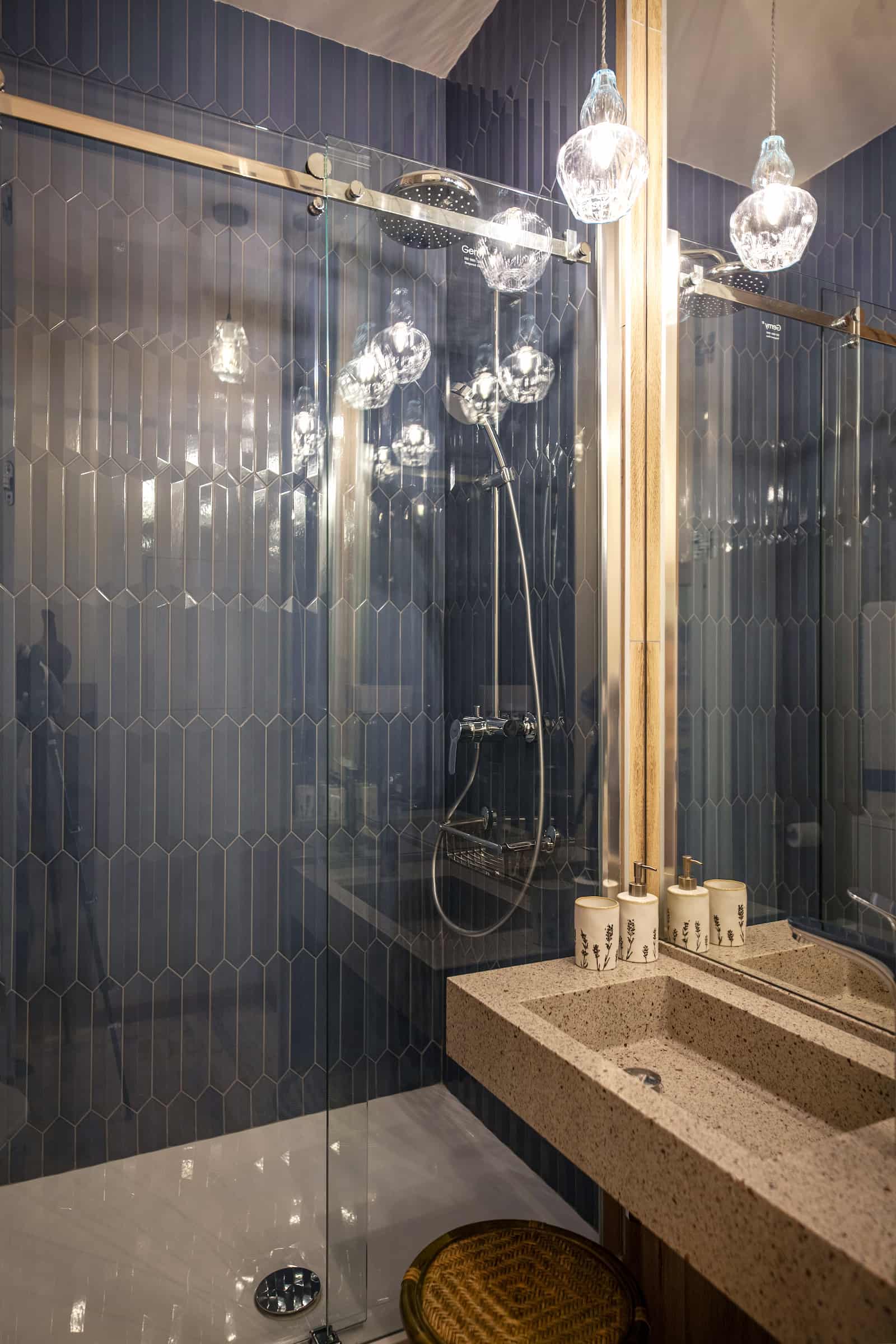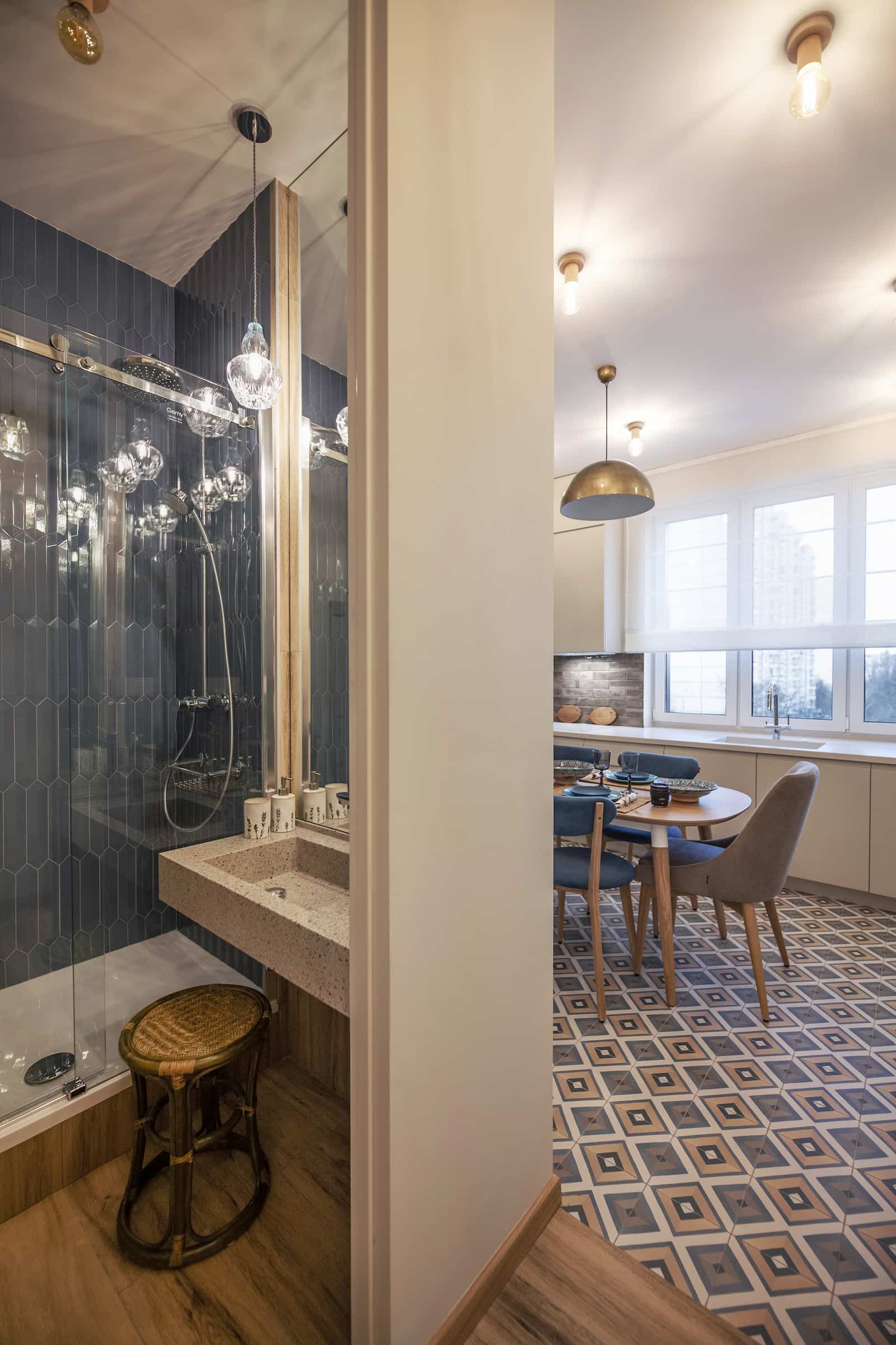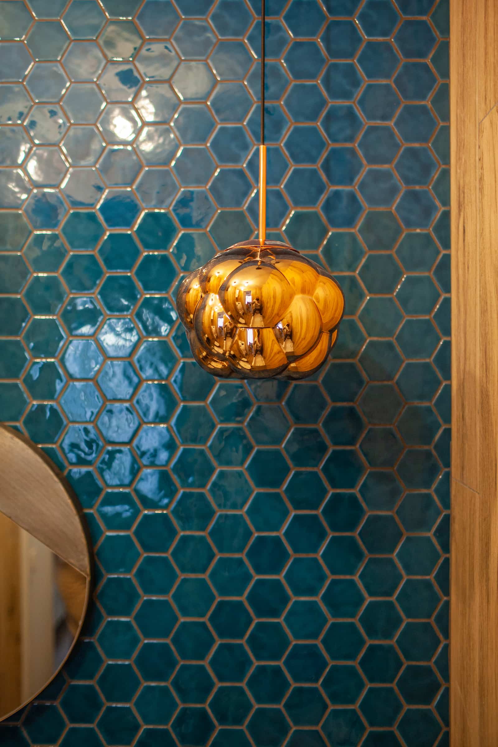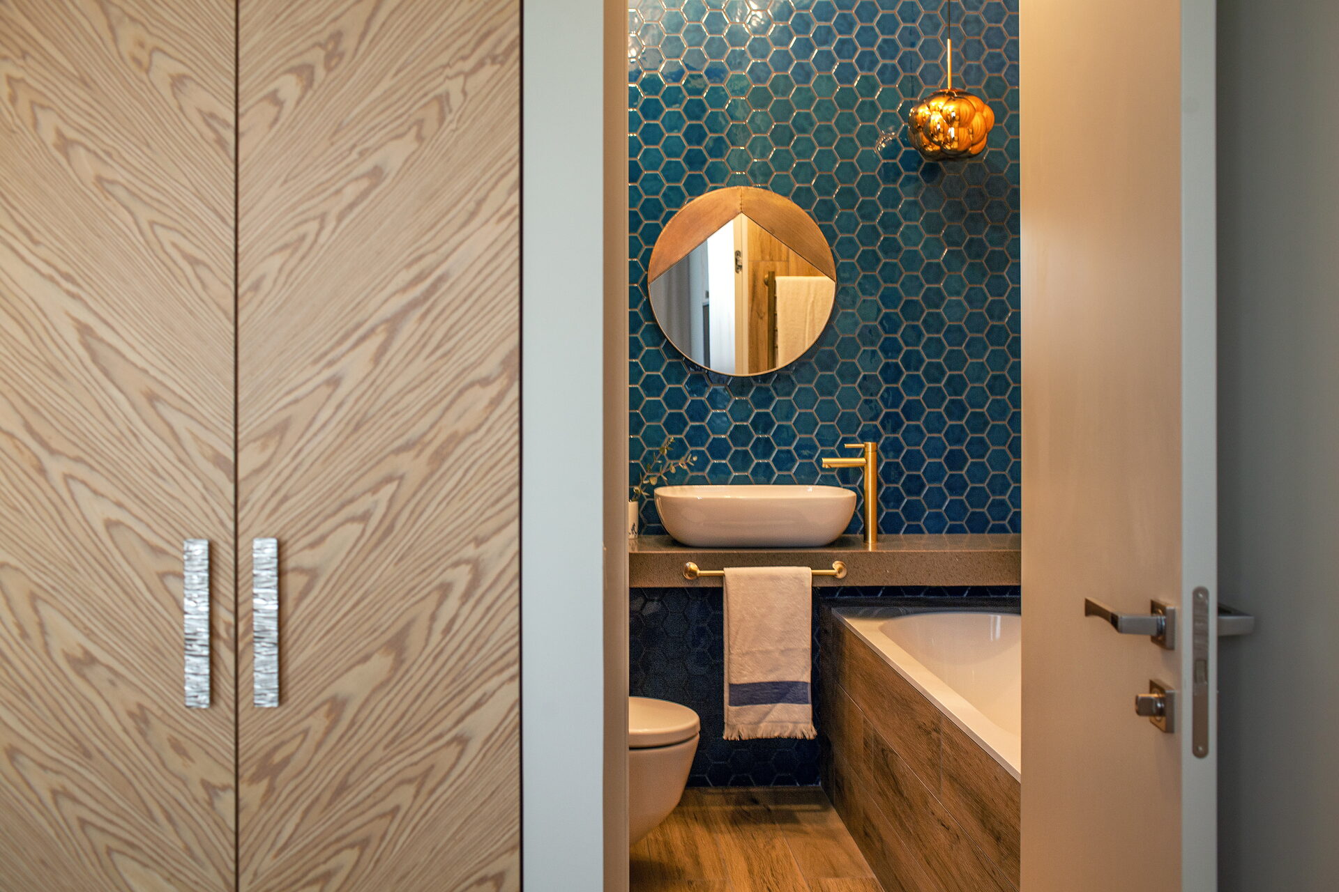 В квартире два санузла: один из них располагается при входе, во второй главный можно попасть из спальни. Здесь продолжили общую концепцию интерьера, уравновесив глубокий синий цвет и эффектную раскладку плитки спокойным деревом и мягким золотым блеском сантехники и светильника-подвеса.