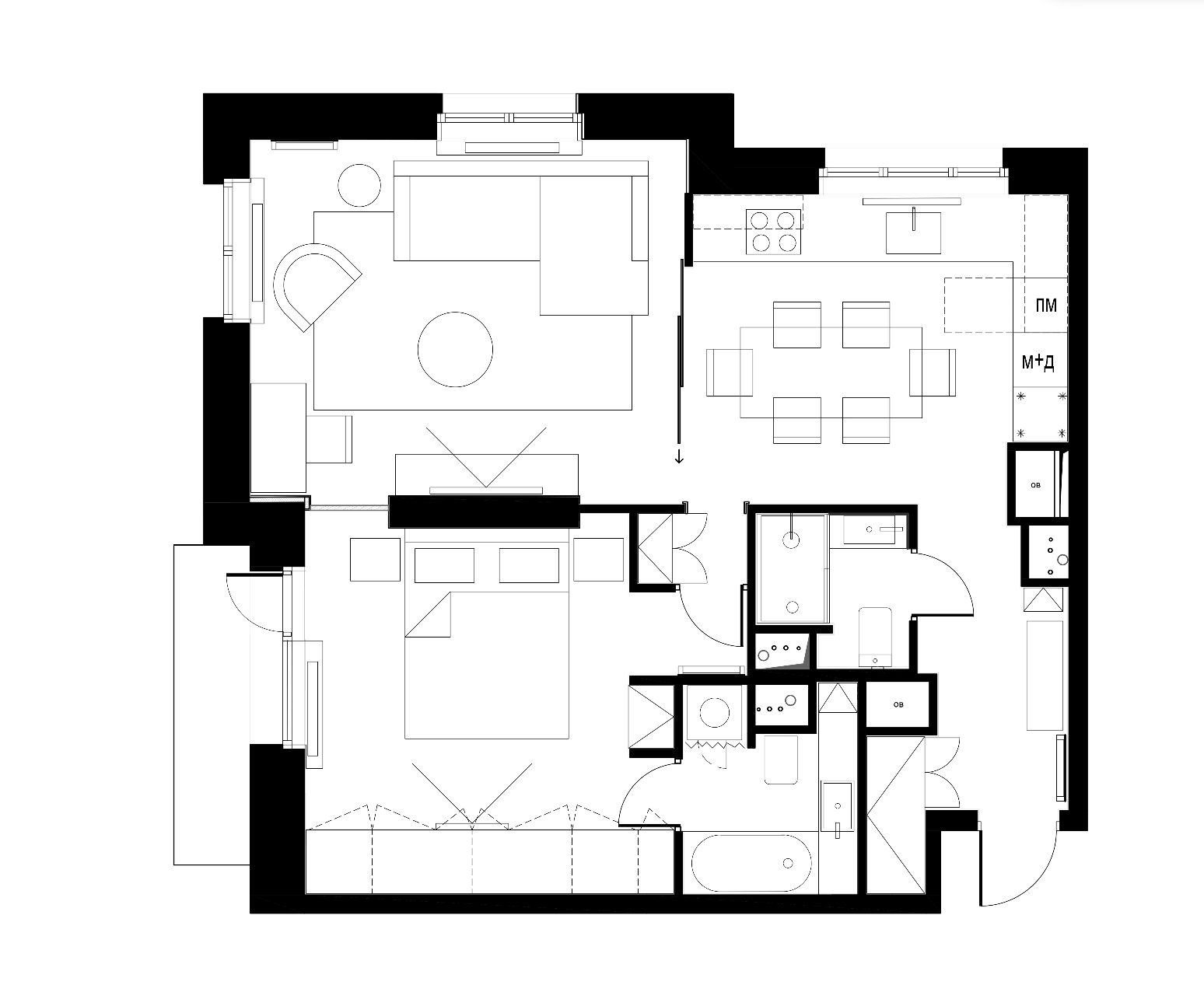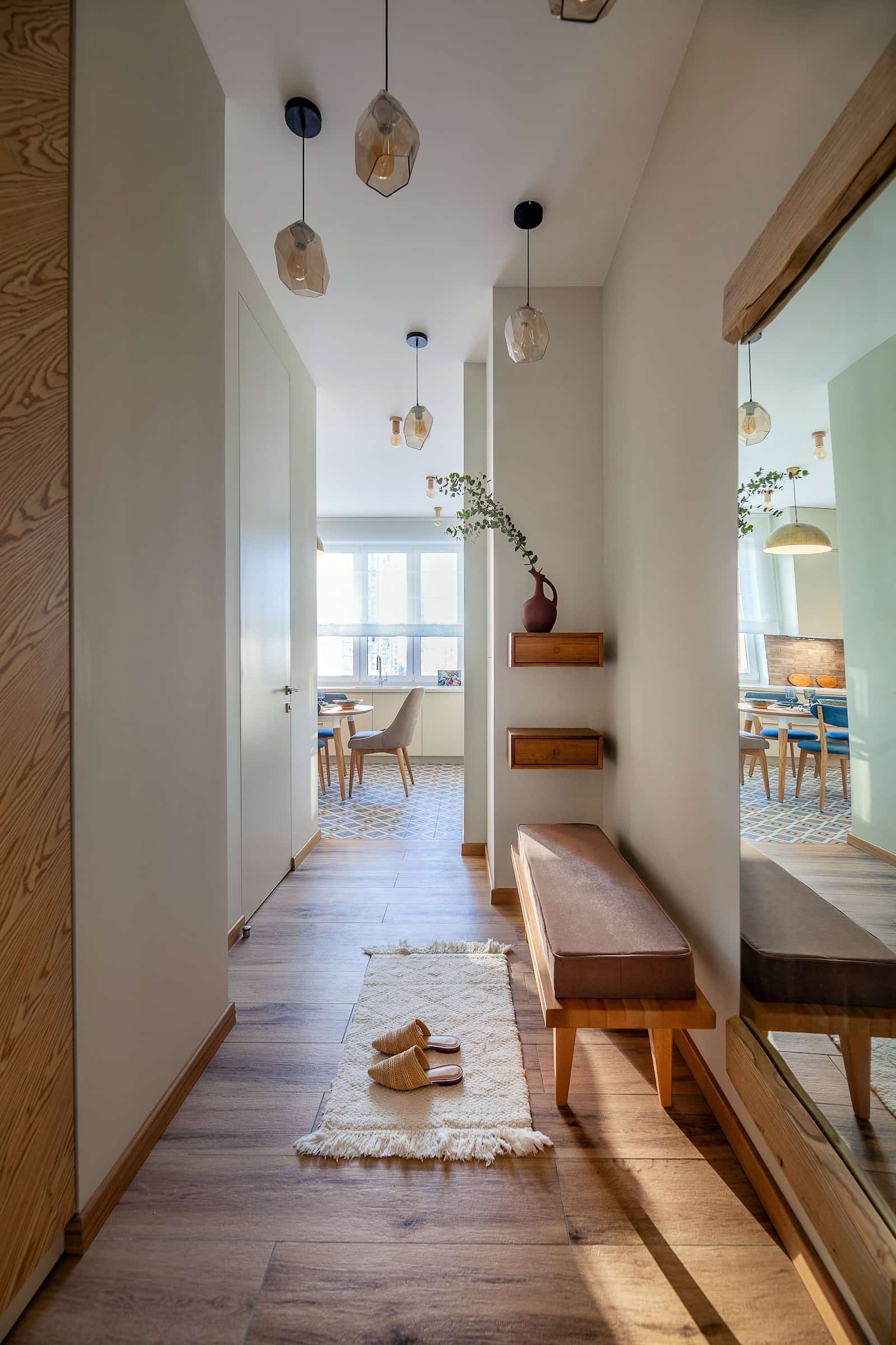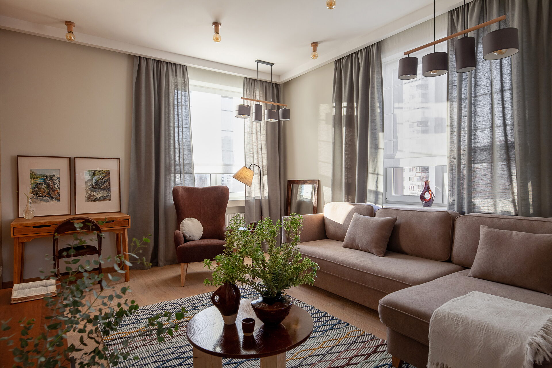 Квартира «СЧАСТЬЕ» — этот интерьер изобилует интересными фактурами, сочными цветами, эффектными декоративными решениями. И именно такое теплое и радушное пространство как нельзя лучше отражает характер владельцев – супружеской пары, которые умеют наслаждаться жизнью и общением с близкими. Работу над этим проектом было решено начать с разработки идеального планировочного решения. Важно было и обеспечить хозяевам, людям в возрасте, территорию, где они смогут полноценно отдохнуть, и организовать общественную зону, и продумать решения, которые позволят с комфортом принимать гостей.