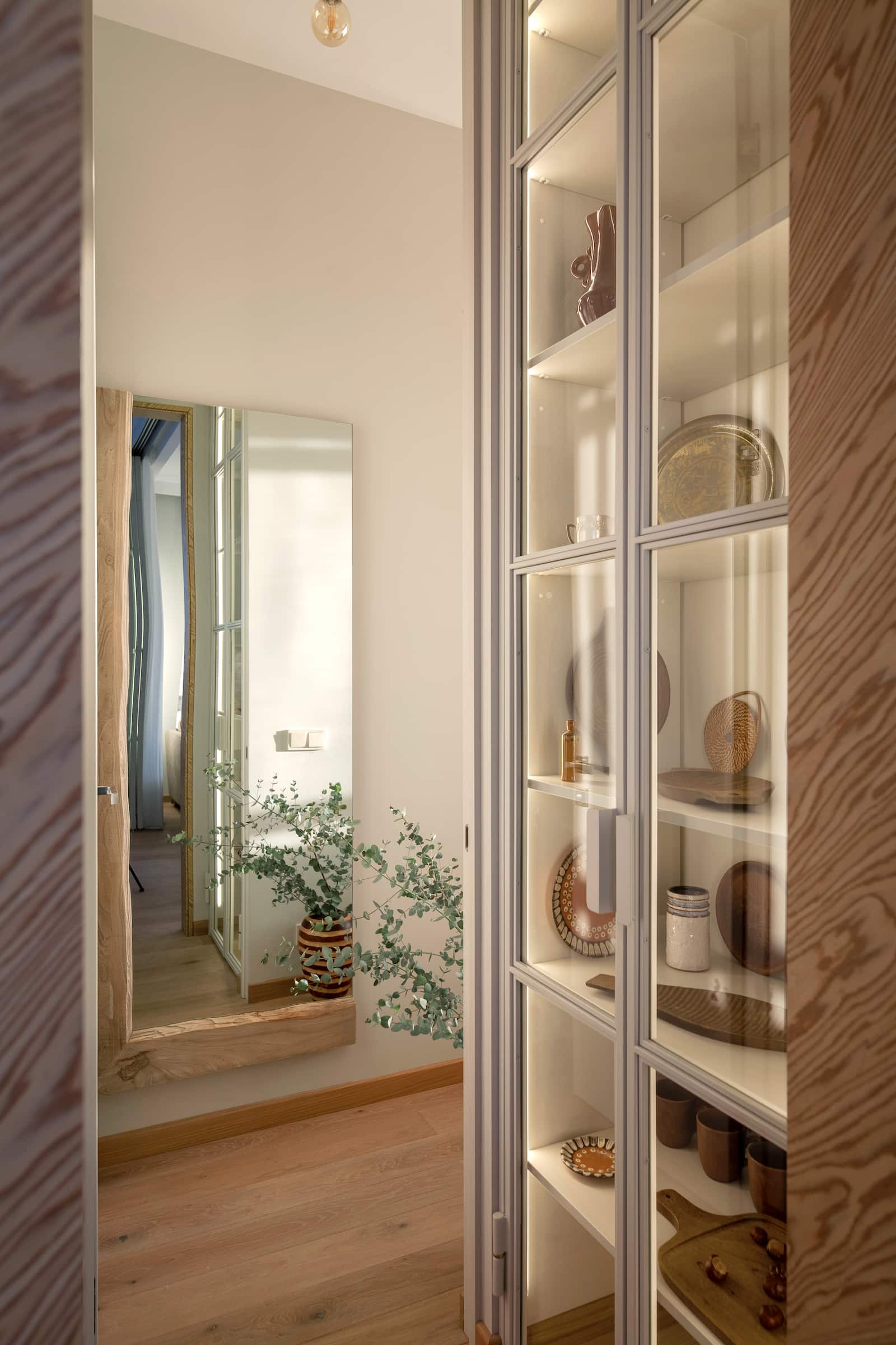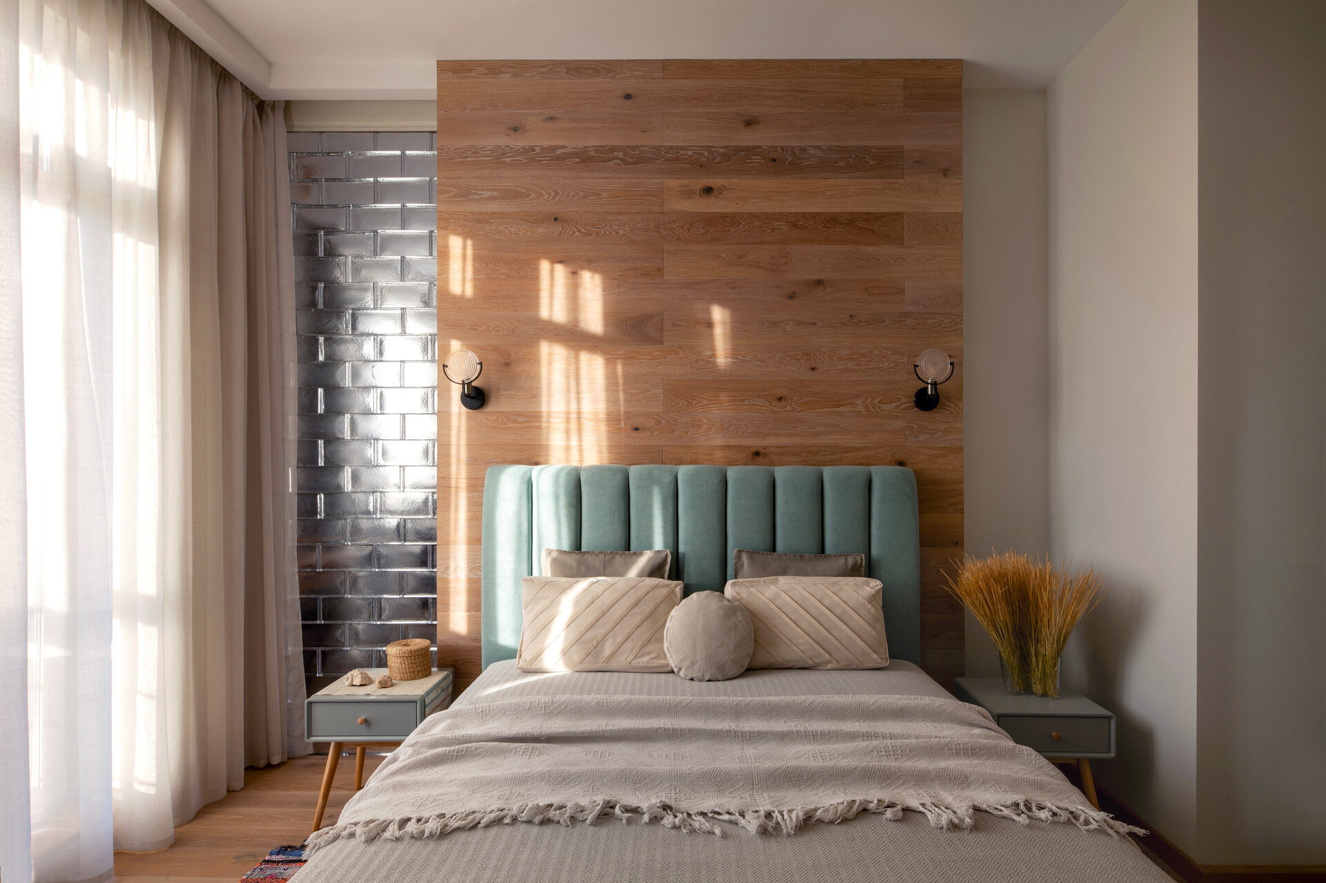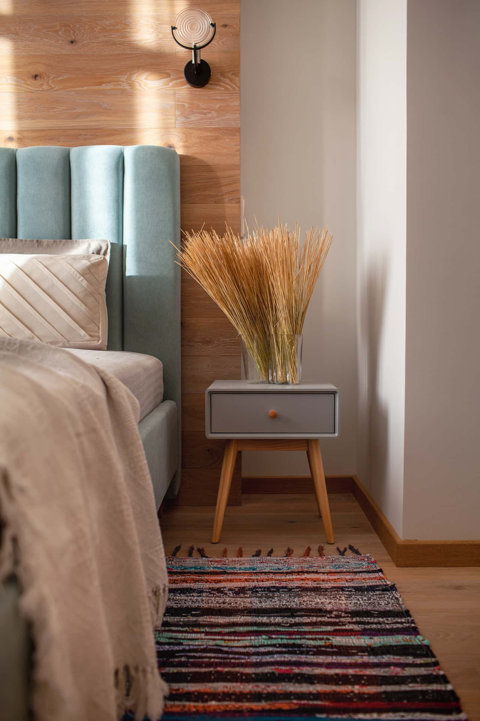 Спальня получилась более мягкой: припыленные оттенки, светлое дерево привносят в интерьер естественность и простоту. Меблировка комнаты довольно минималистична, что также позволяет сохранить в интерьере визуальную легкость.