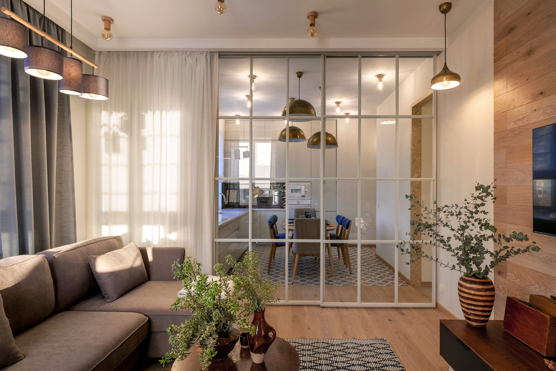 В квартире выделилось две основные части. Общественная зона представляет собой объединенное пространство гостиной и столовой-кухни. При этом две зоны разделены стеклянной перегородкой, дополненной шторой. Так помещение не потеряло ни грана воздушности и легкости – что особенно ценно, поскольку в квартире много окон, и это изумительное ощущение наполненности светом дизайнеру терять не хотелось.