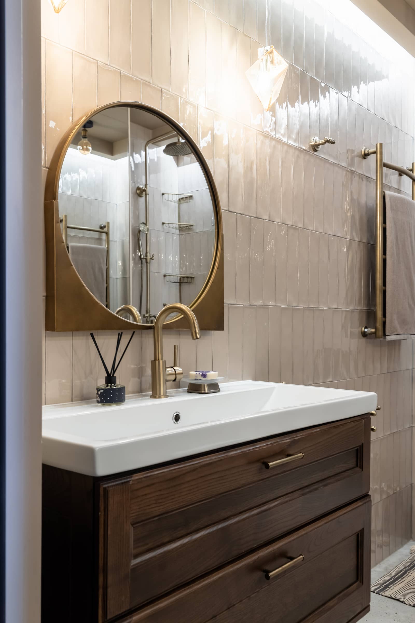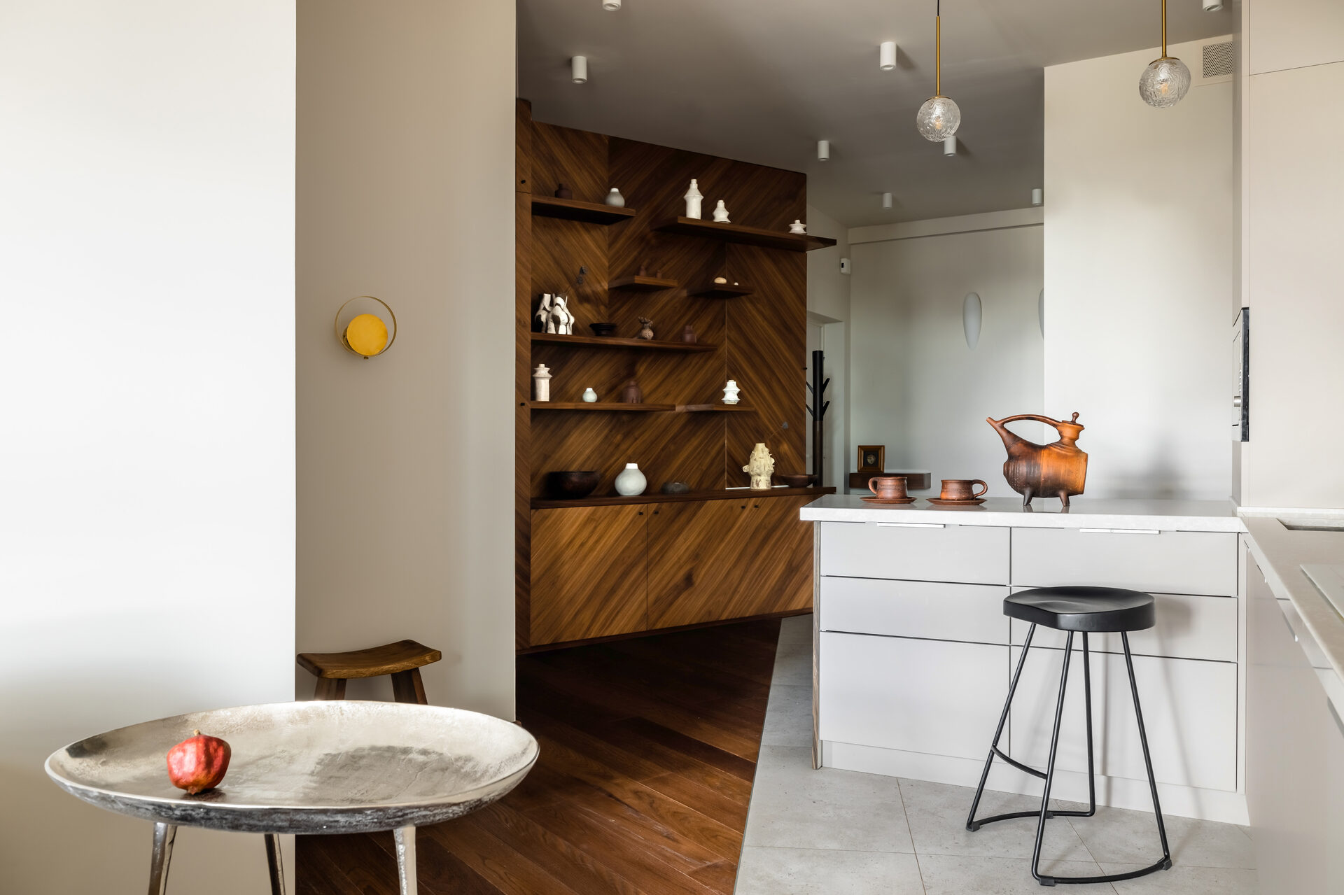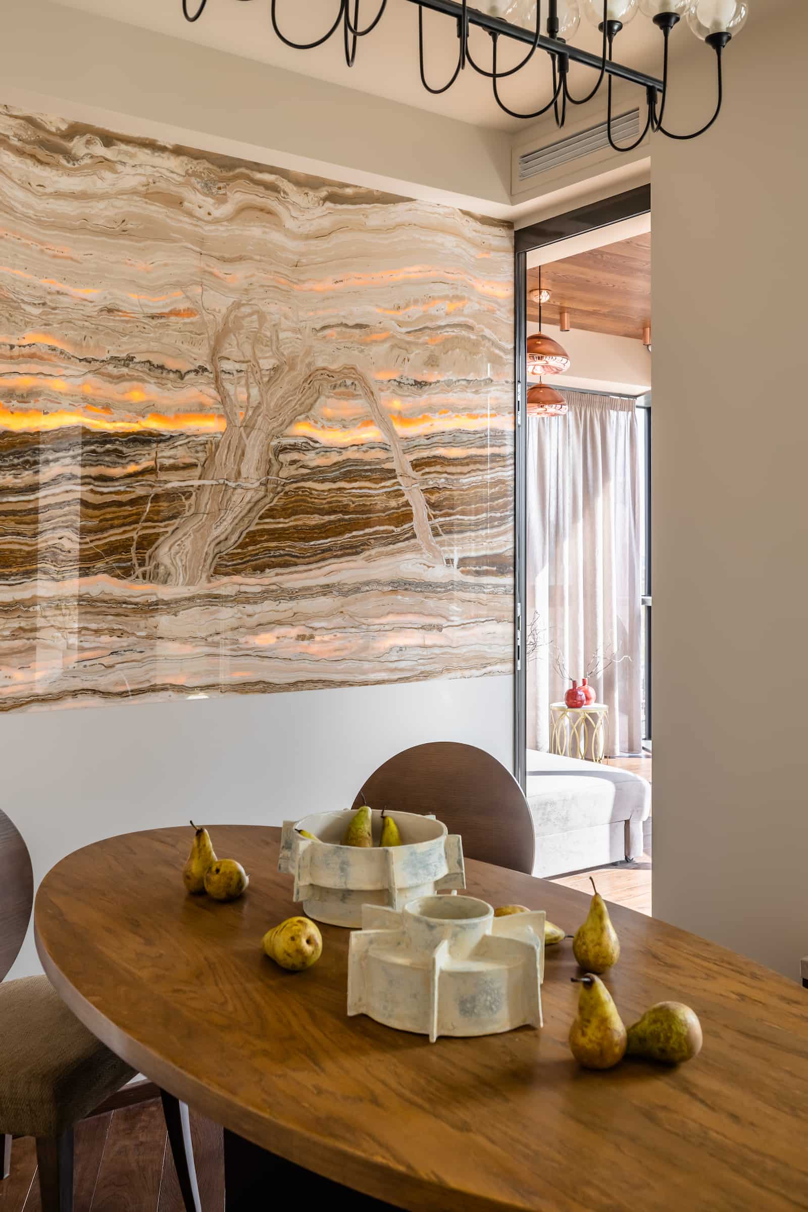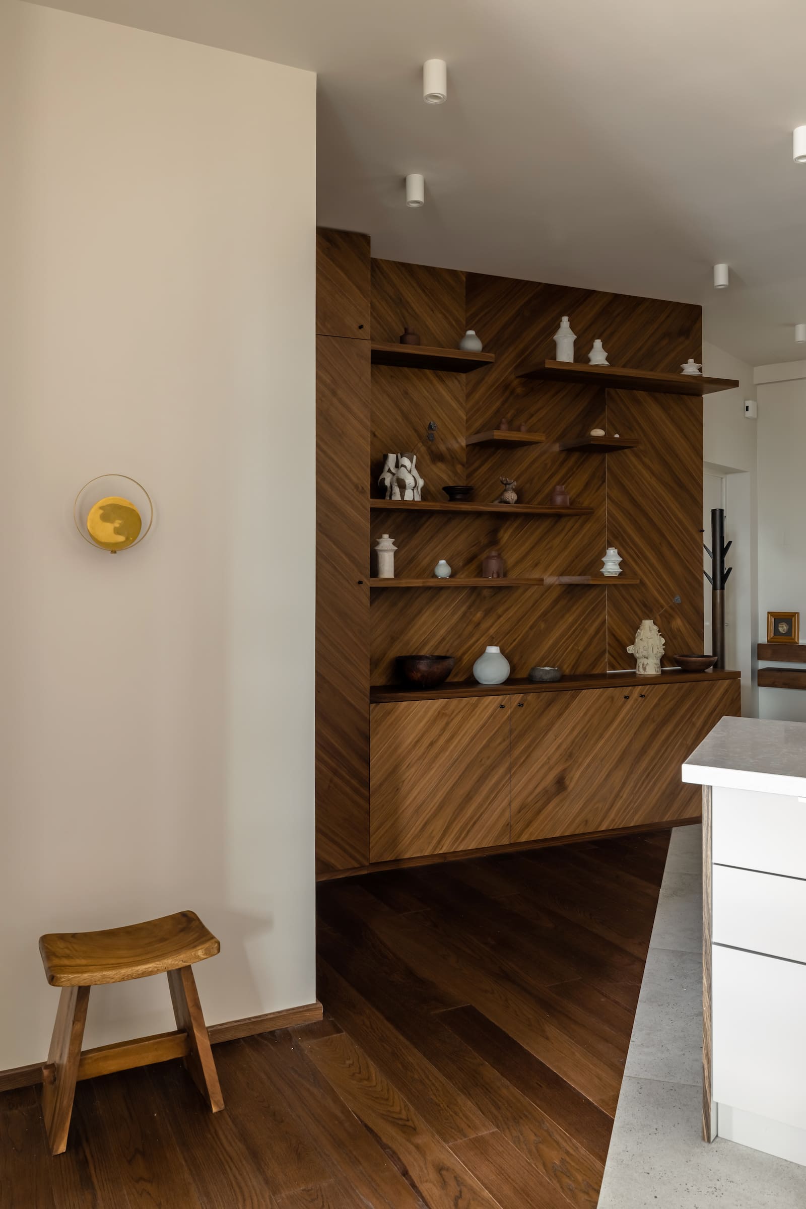 Соседство остроугольных форм с округлыми элементами мебели и декора, противопоставление светлых оттенков с плотной фактурой орехово-шоколадного дерева, слэб из оникса с подсветкой и металлизированная штукатурка – детали этого многогранного пространства вступают в диалог, развивают интерьерные события в самом неожиданном ключе, образуют богатый и цельный ансамбль. Неординарная керамика от Анны Лыфенко и Анастасии Самсоновой филигранно оттенила достоинства оригинального самобытного интерьера.