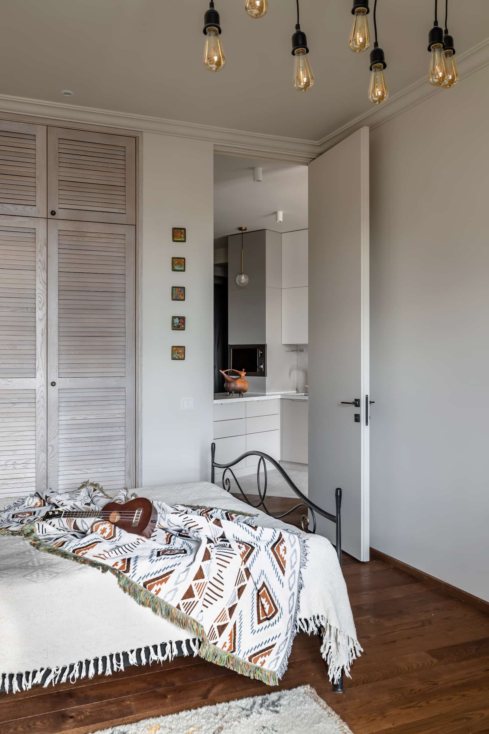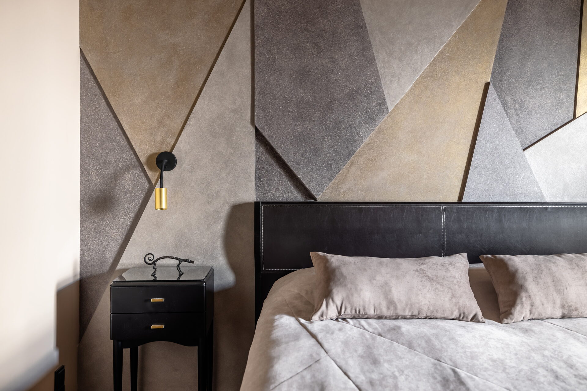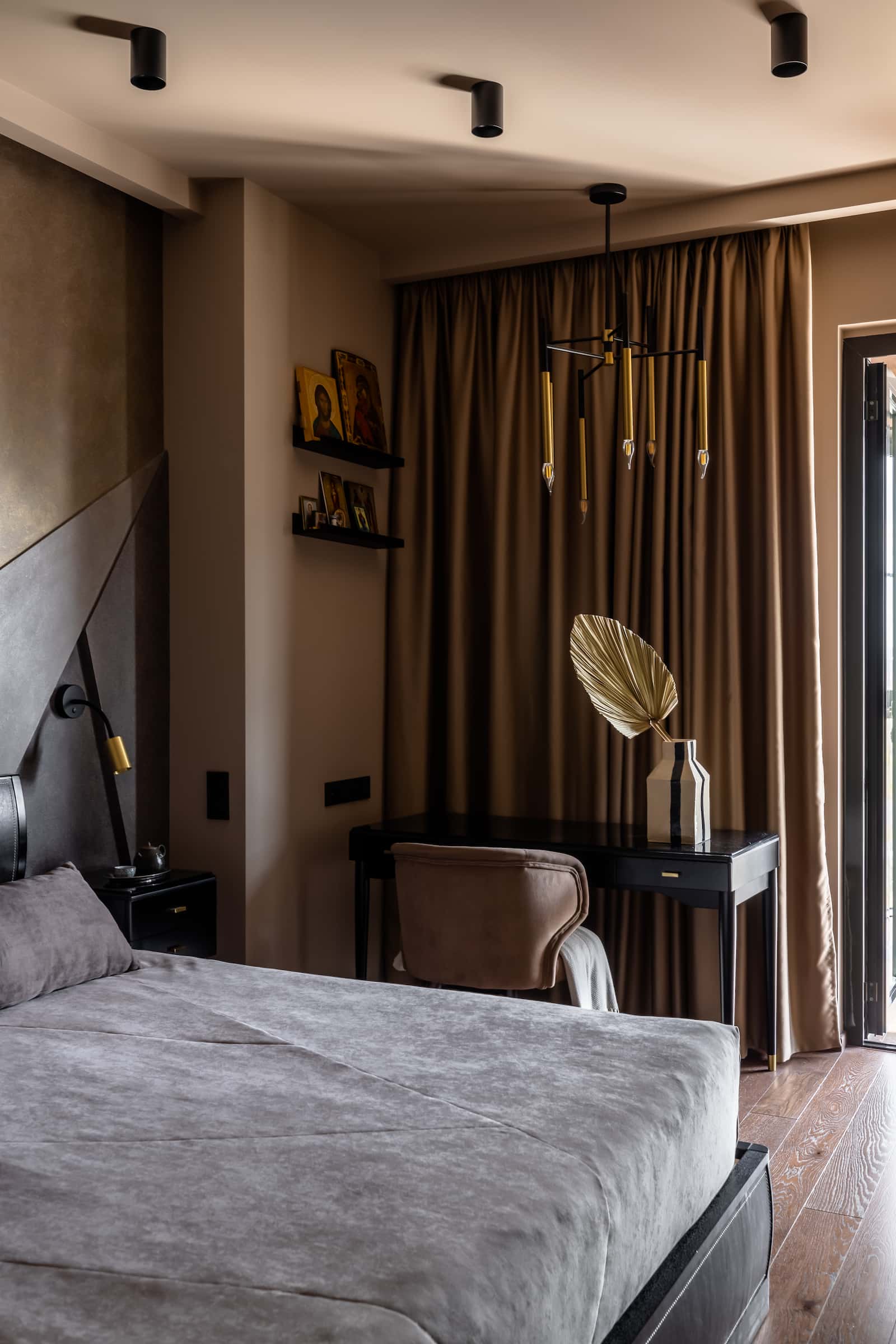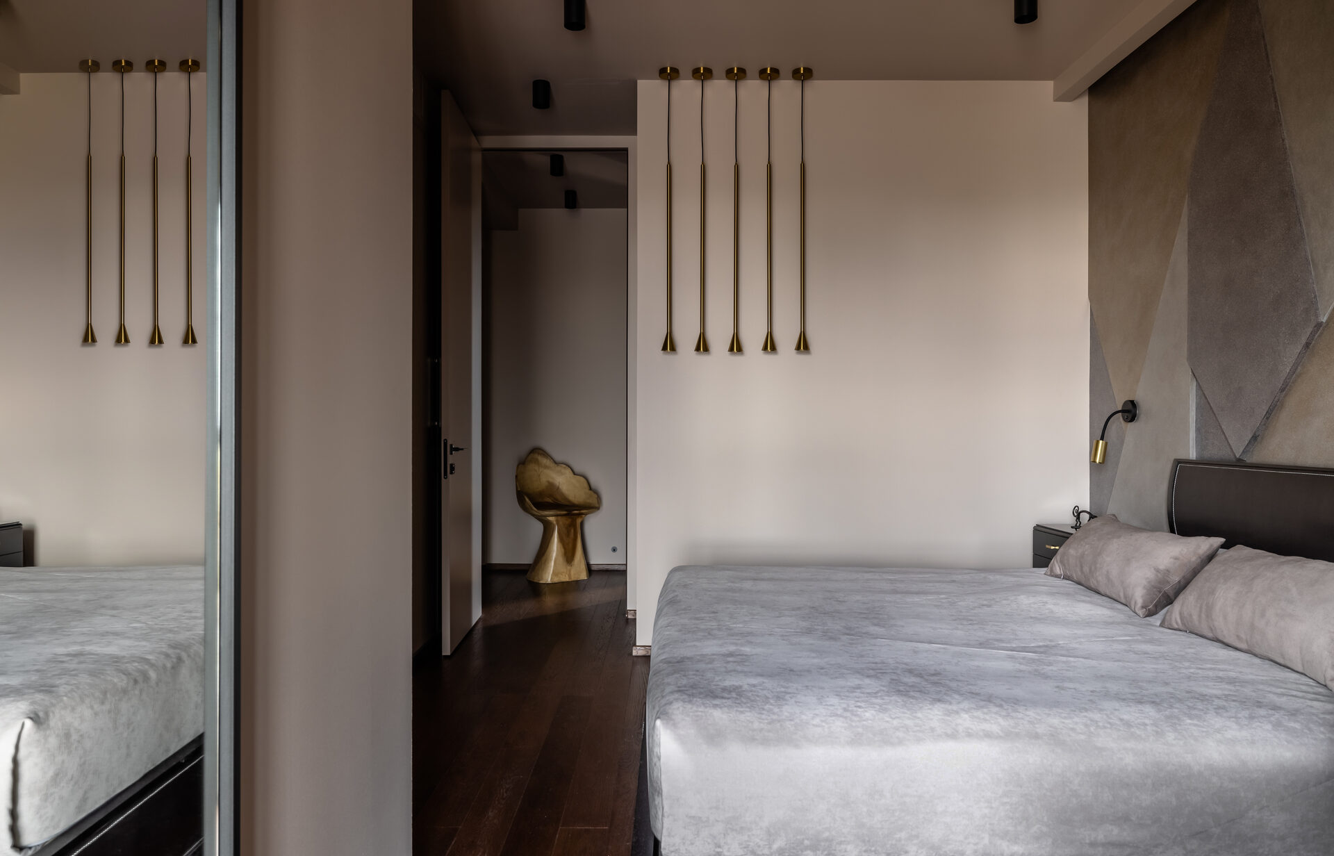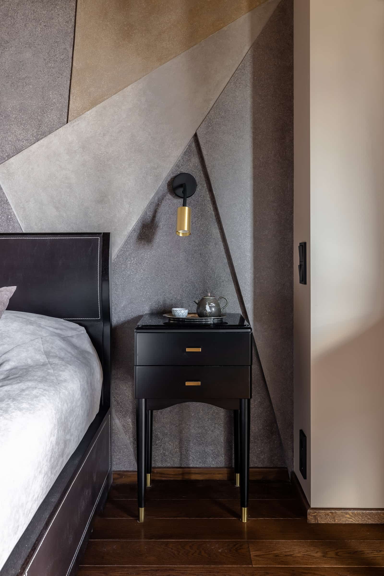 Разнохарактерными, но гармонично вписанными в концепцию получились спальни. Комната дочери – позитивная, естественная и романтичная. Непринужденность, свойственную скандинавскому стилю, дополнили элементами бохо, создав творческую и уютную атмосферу. Главная спальня отличается удивительным спокойствием и уравновешенностью. Сложные приглушенные оттенки, фактуры с металлизированным блеском, темная строгая мебель образуют интерьер благородный и респектабельный. лавная спальня. Полигональное панно в изголовье кровати, создает образ скалы разных оттенков гранита. Эти оттенки удалось получить с помощью декоративных французских штукатурок. Покрывало на кровати выстрочено по тому же рисунку.