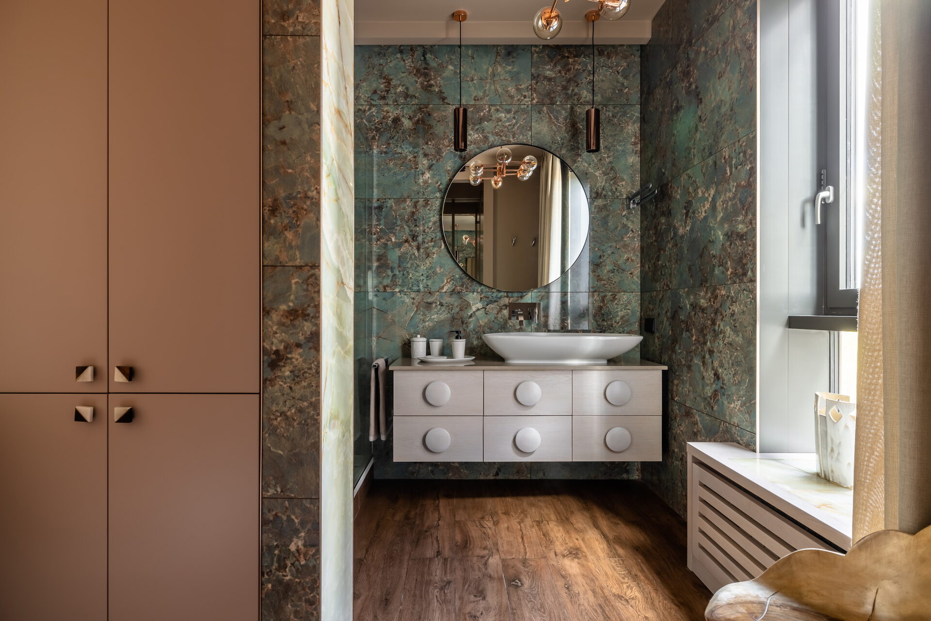 В главном санузле, которому досталось окно, задачей было получить вау-эффект, поэтому керамогранит Rex с запоминающимся рисунком соединили с зеленым ониксом с подсветкой, которая выполняет функцию светильника. Консоль с элипсовидной раковиной изготовлена из беленого дуба по эскизу дизайнера, стул, вырезанный из массива тика, привезен из Азии.
