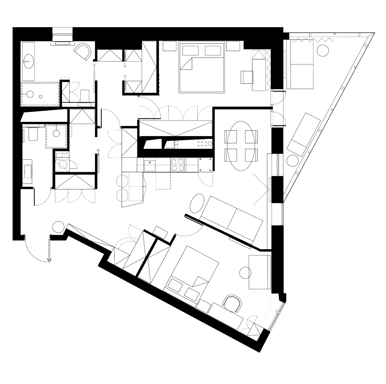 Квартира " POLYGONAL" — Острота, форма и сила отличают необычный и эффектный интерьер. Пространство отличалась настолько нестандартной конфигурацией, что никакие привычные решения сюда бы просто не вписались. Треугольник, продиктованный планом дома, вдохновил на создание необычной планировки с круговым обходом вокруг кухни и изолированными зонами для двух поколений. Найденное решение оказалось не только визуально интересным, но и очень комфортным.