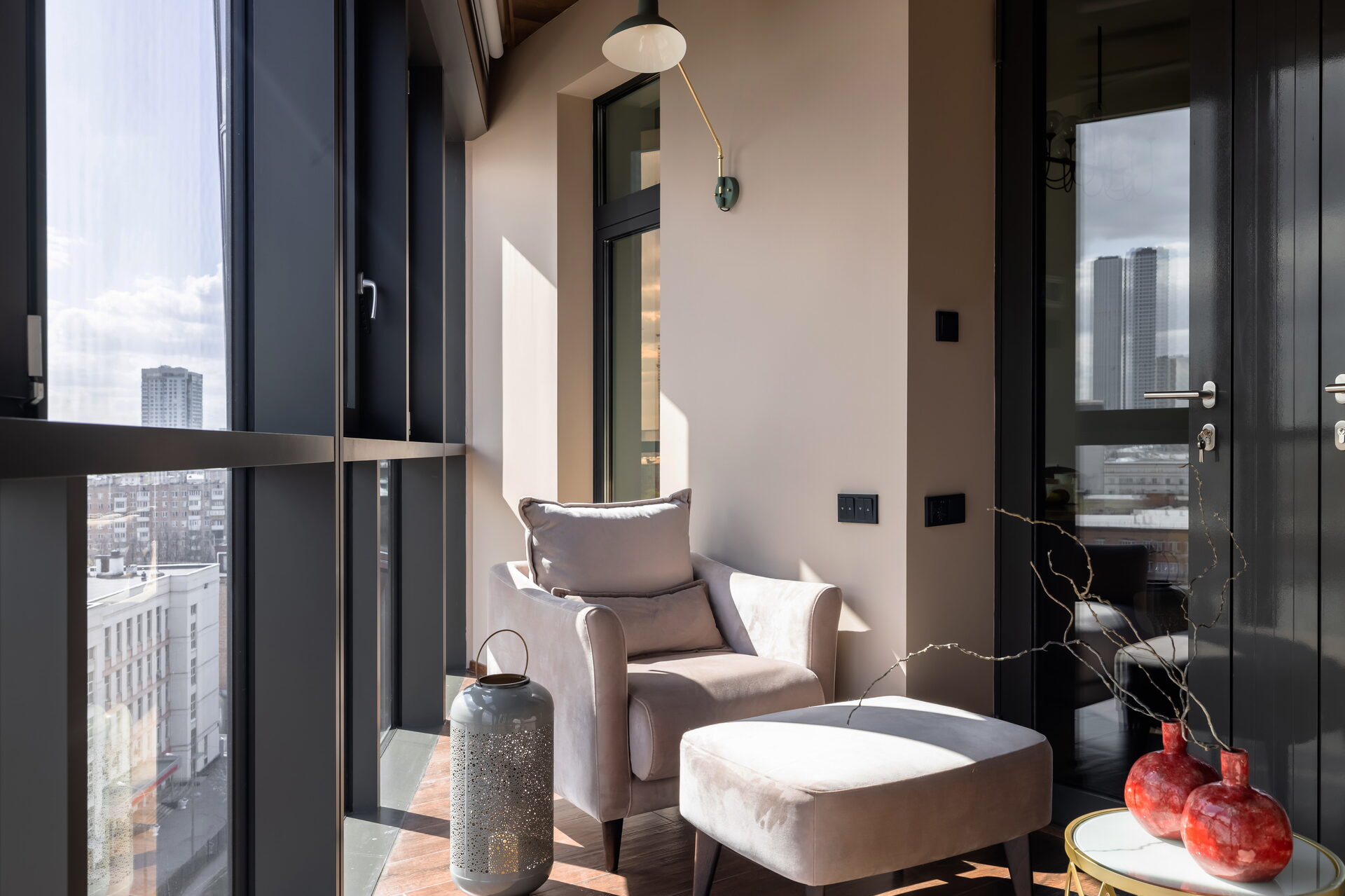Украшением квартиры стала застекленная терраса, вписанная в треугольник. Это зона отдыха, в которую можно выходить из спальни из столовой. Сейчас здесь летнее остекление, но его предполагается заменить на зимнее, чтобы комнатой можно было пользоваться в любую погоду.