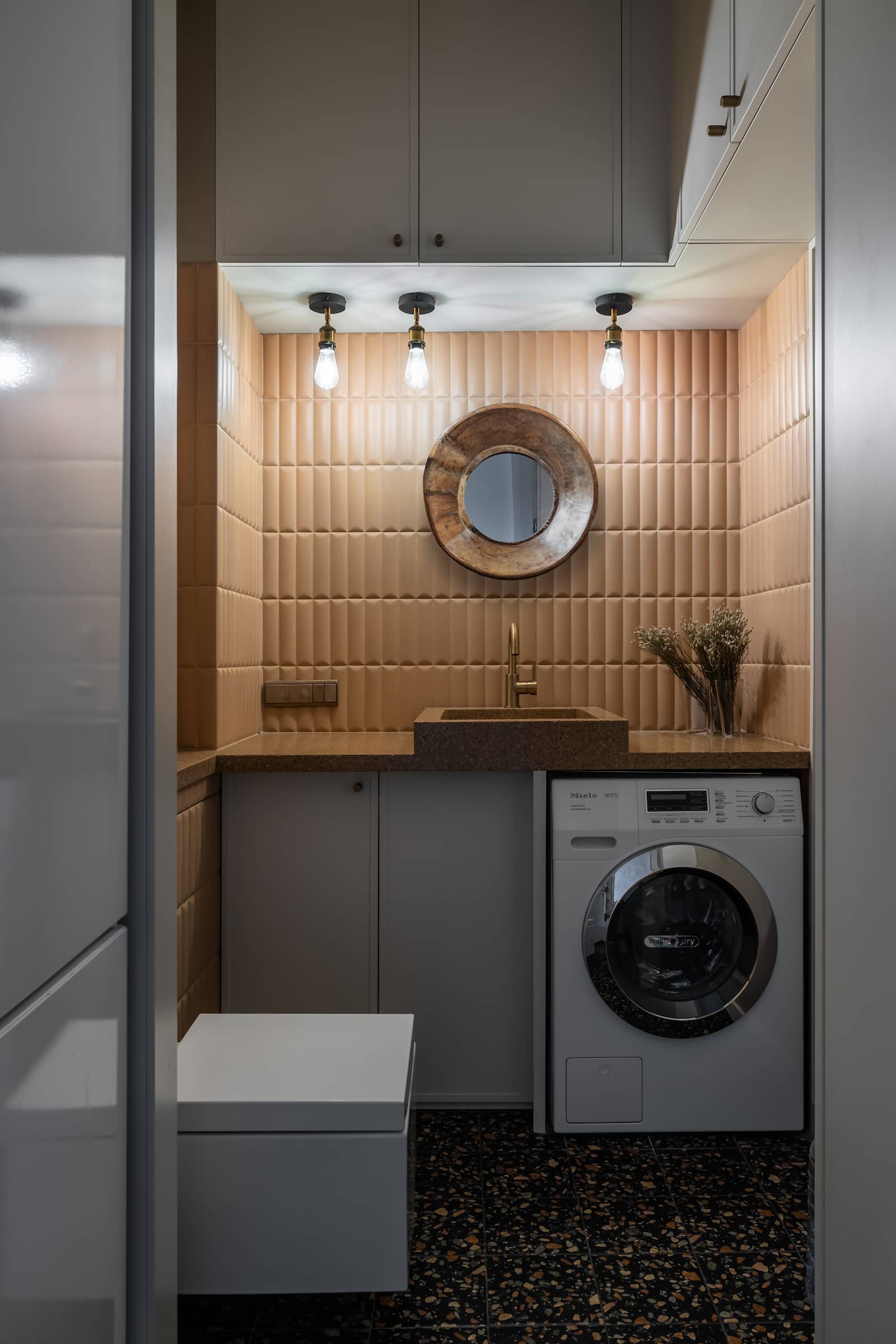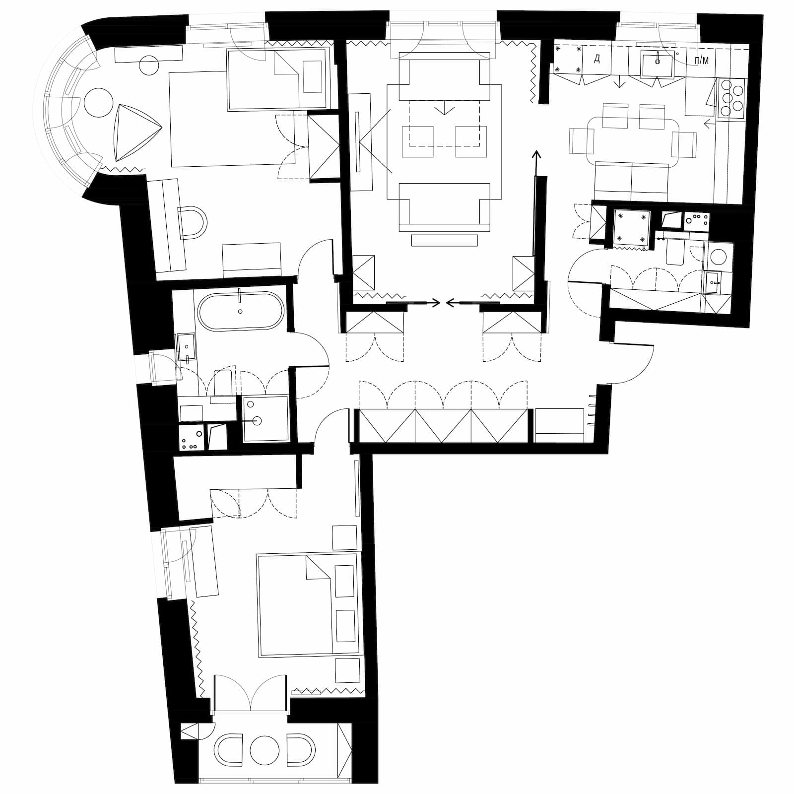 Квартира " SOFT" — задачей было создать светлый и «воздушный» интерьер с изюминкой. Заказчики, семейная пара с уже двумя детьми, хотели создать светлый уютный интерьер, наполненный уникальными предметами и аксессуарами. По просьбе хозяев планировку почти не меняли. Она, к слову, была непростой: большое количество несущих стен, внешняя дугообразная стена, эркер — все это усложняло переустройство плана. Но это не помешало сделать круговой обход через холл, гостиную и кухню-столовую, что визуально расширило пространство. За счет расширения и увеличения высоты дверных проемов, там, где это было возможно, впустили больше света и воздуха в помещения.