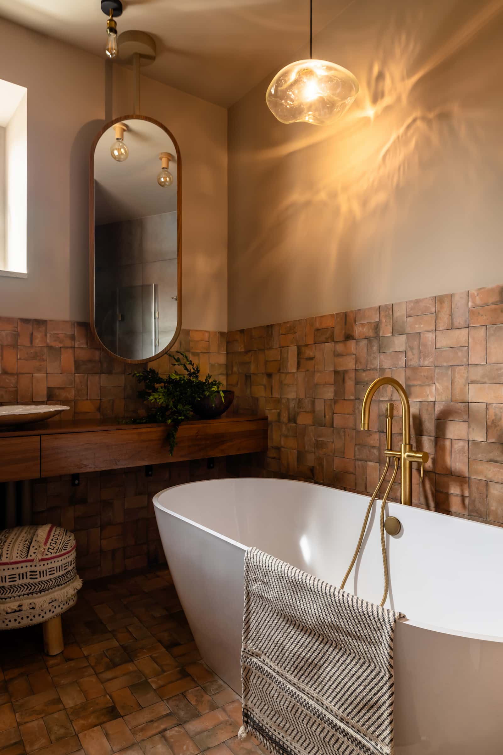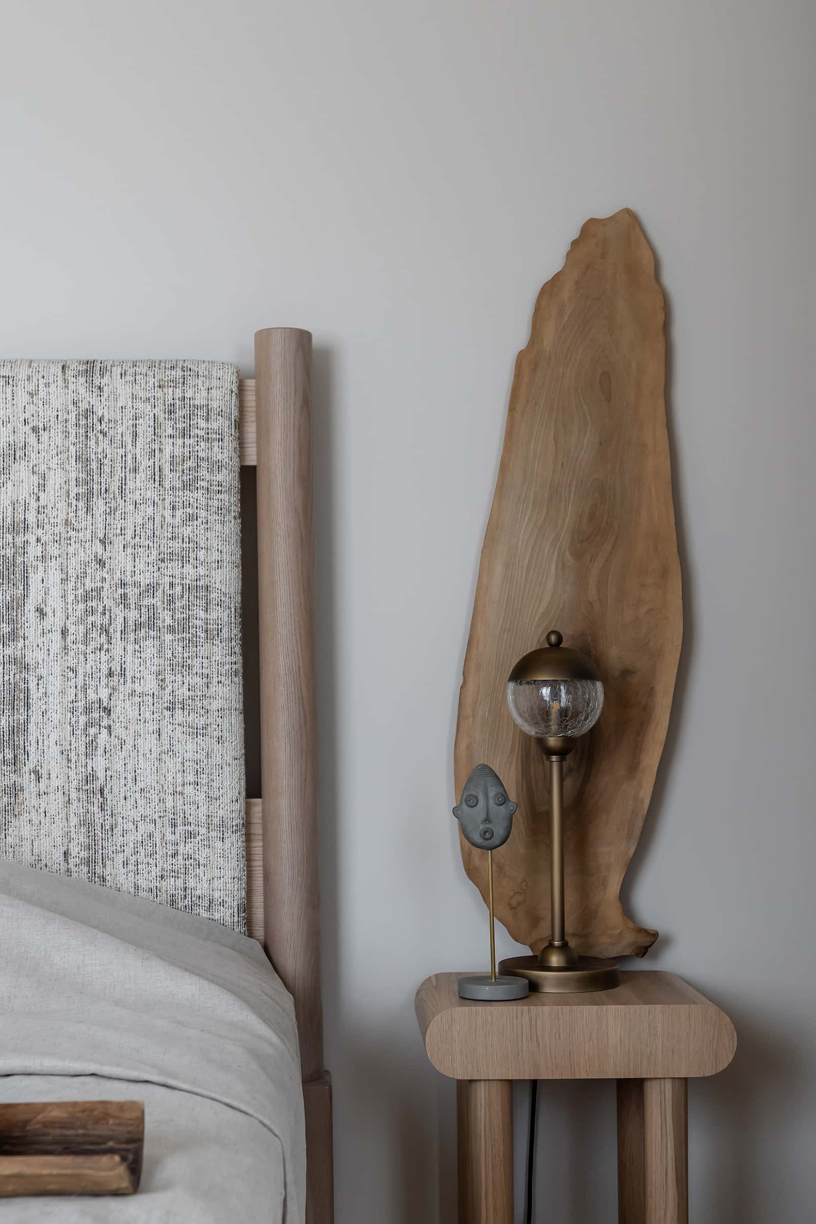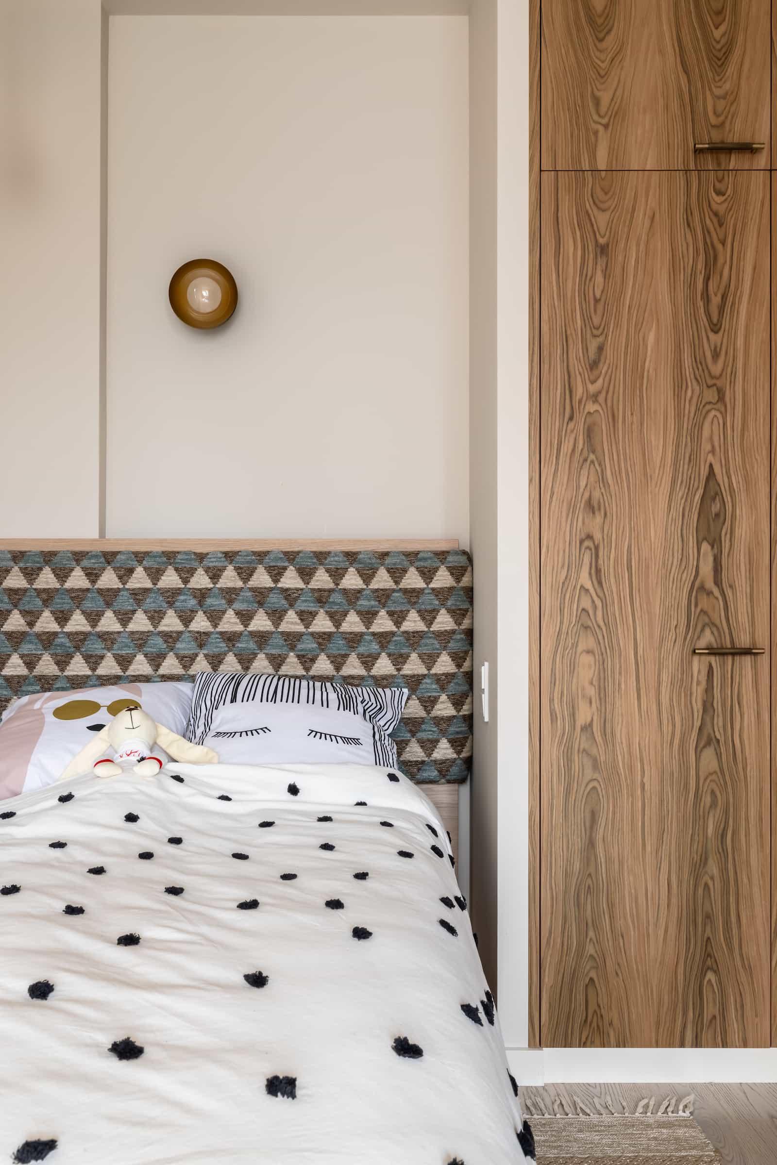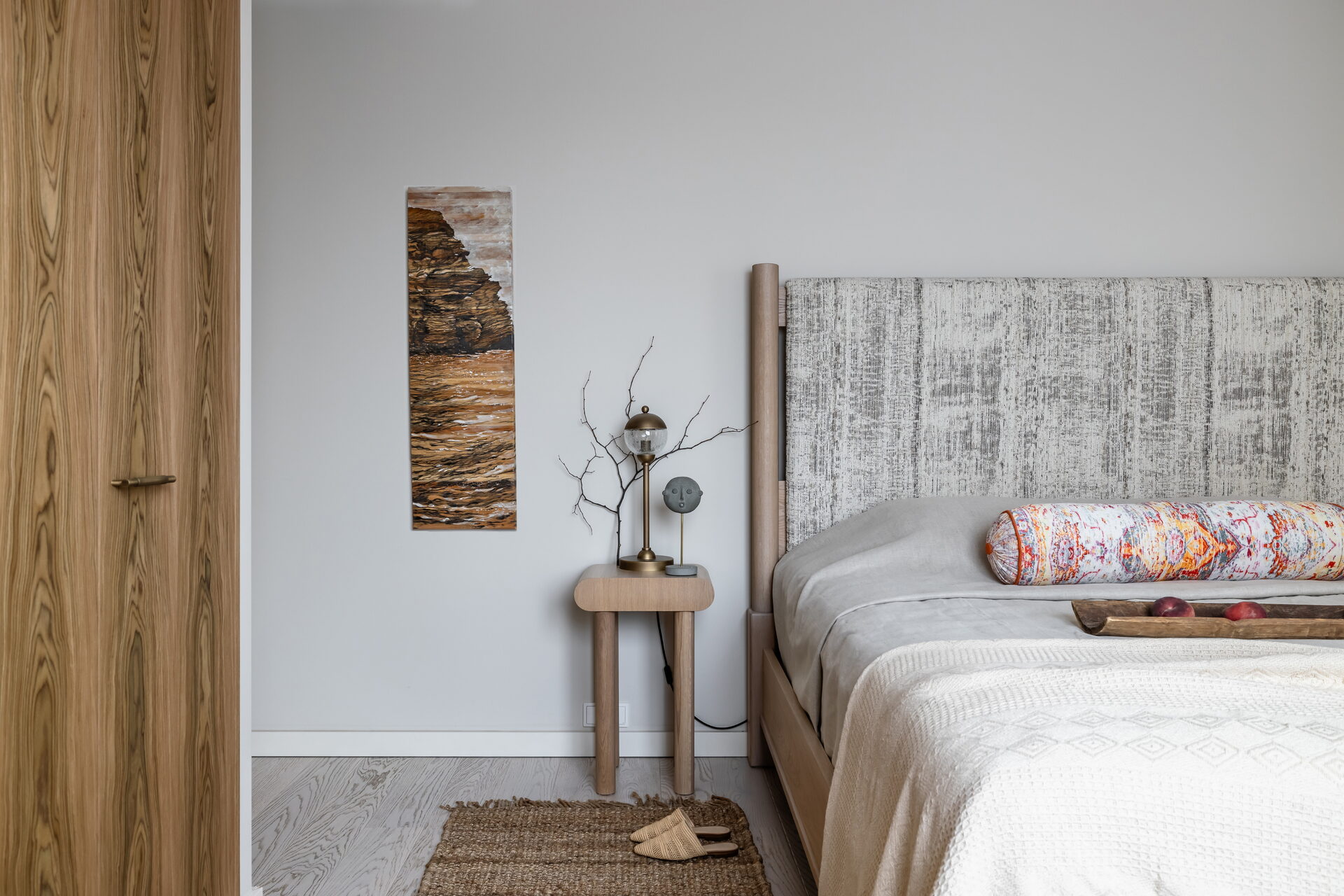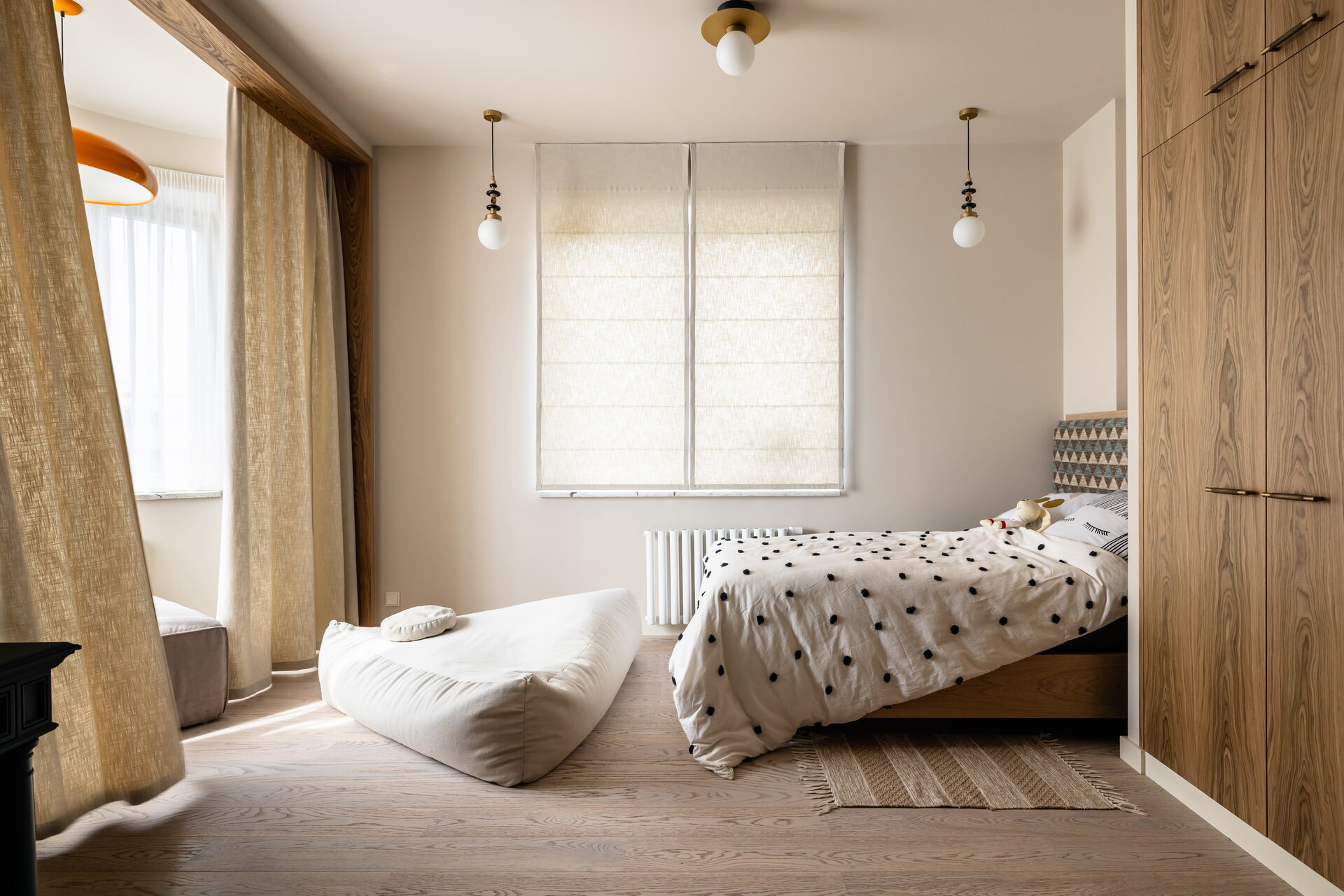 Большая часть мебели в квартире сделана на заказ. Кровати в спальне и детской, а также банкетка в прихожей были изготовлены из массива с использованием тканей с этническими рисунками.