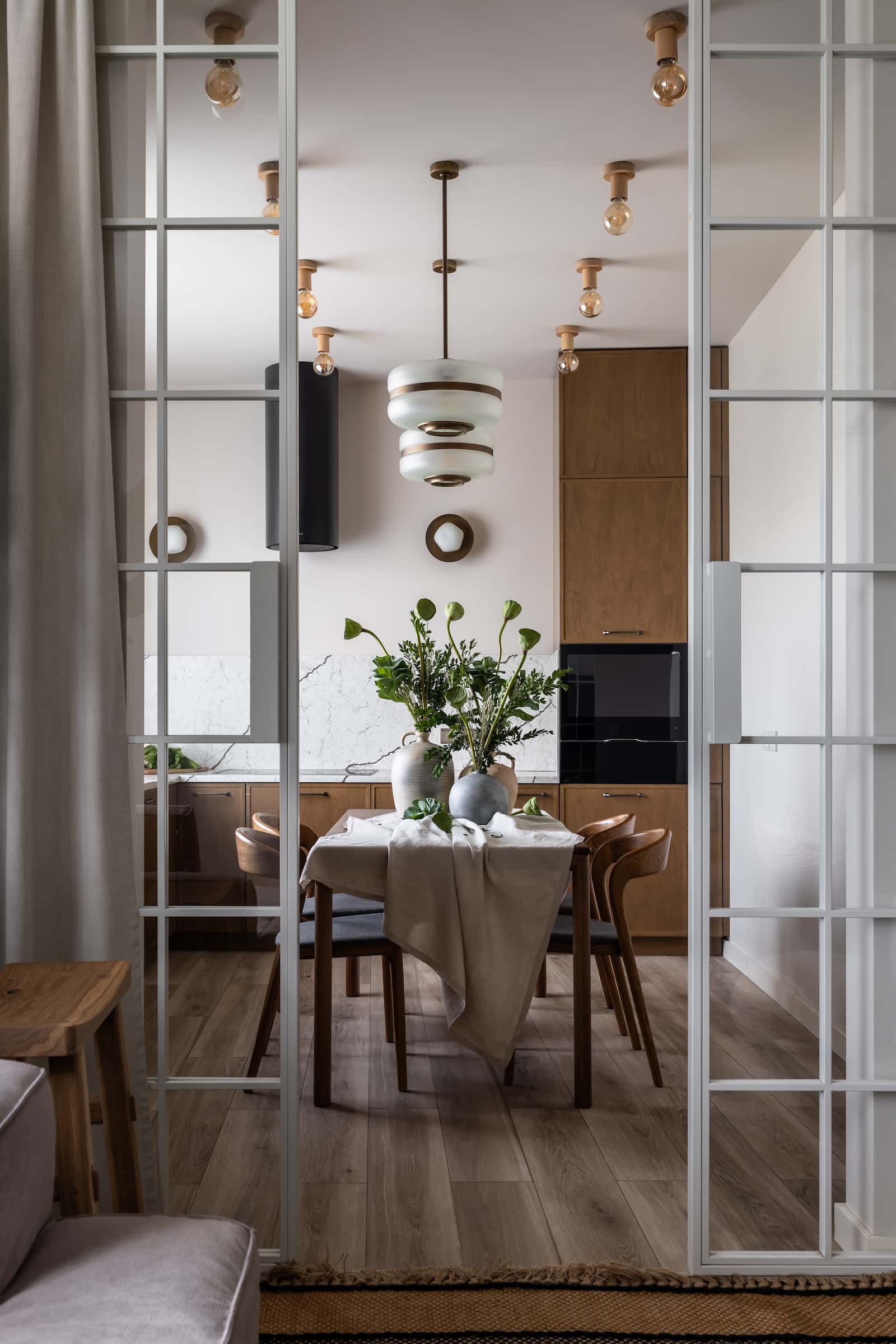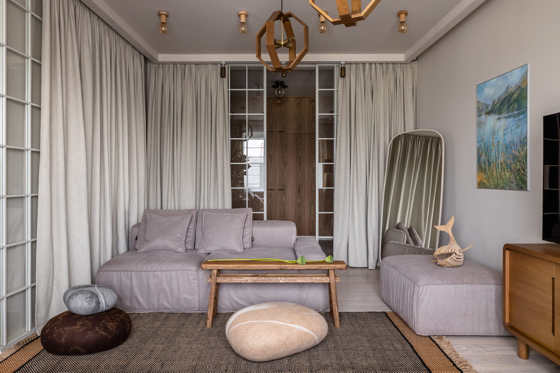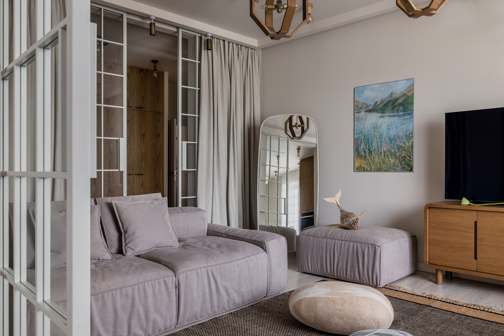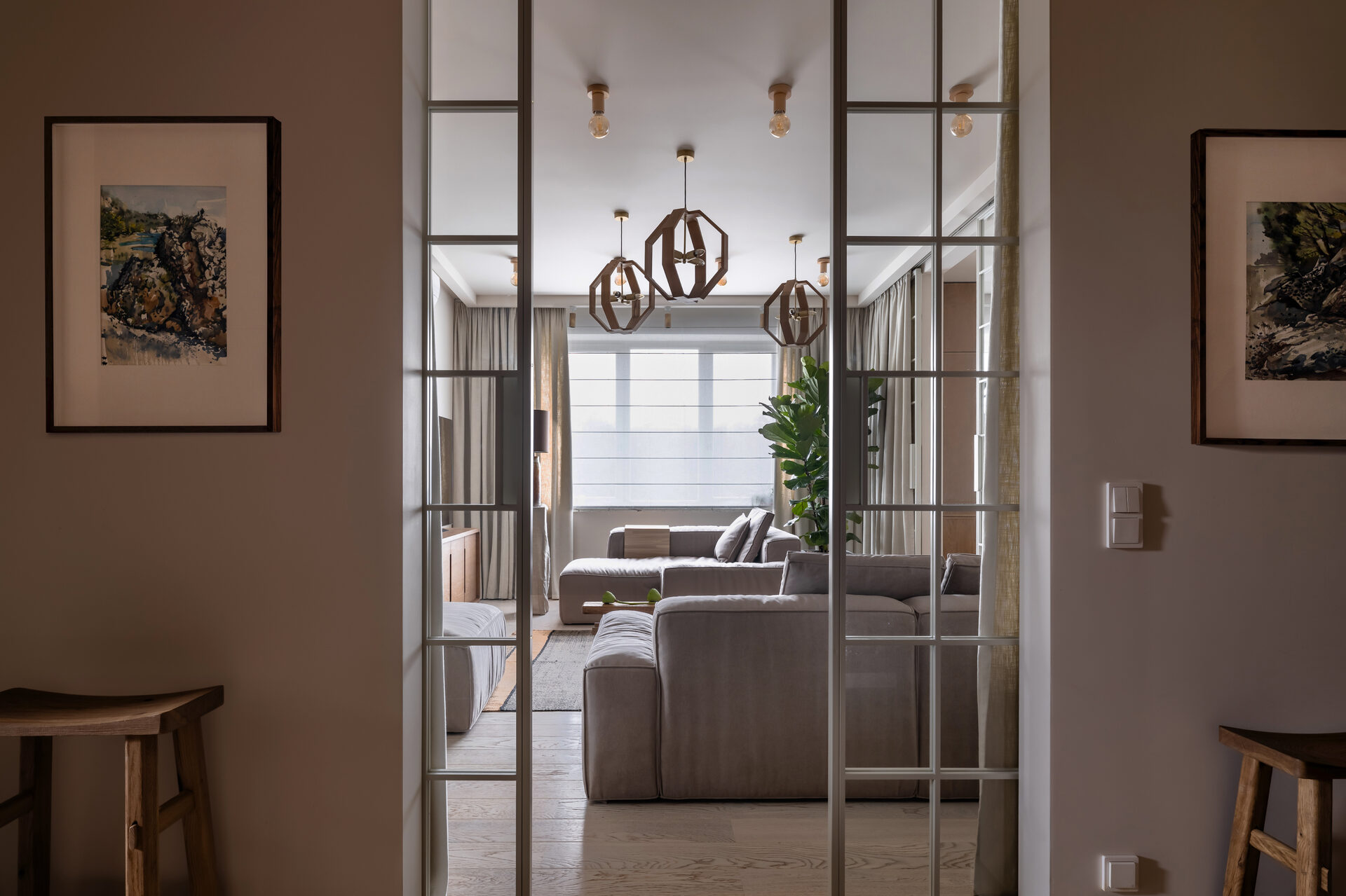 Чтобы создать обволакивающую атмосферу, для стен мы выбрали мягкий серо-бежевый оттенок. Тот же цвет использовали в отделке раздвижных стеклянных перегородок и межкомнатных дверей из массива ольхи, и даже гардины подобрали в тон стенам.