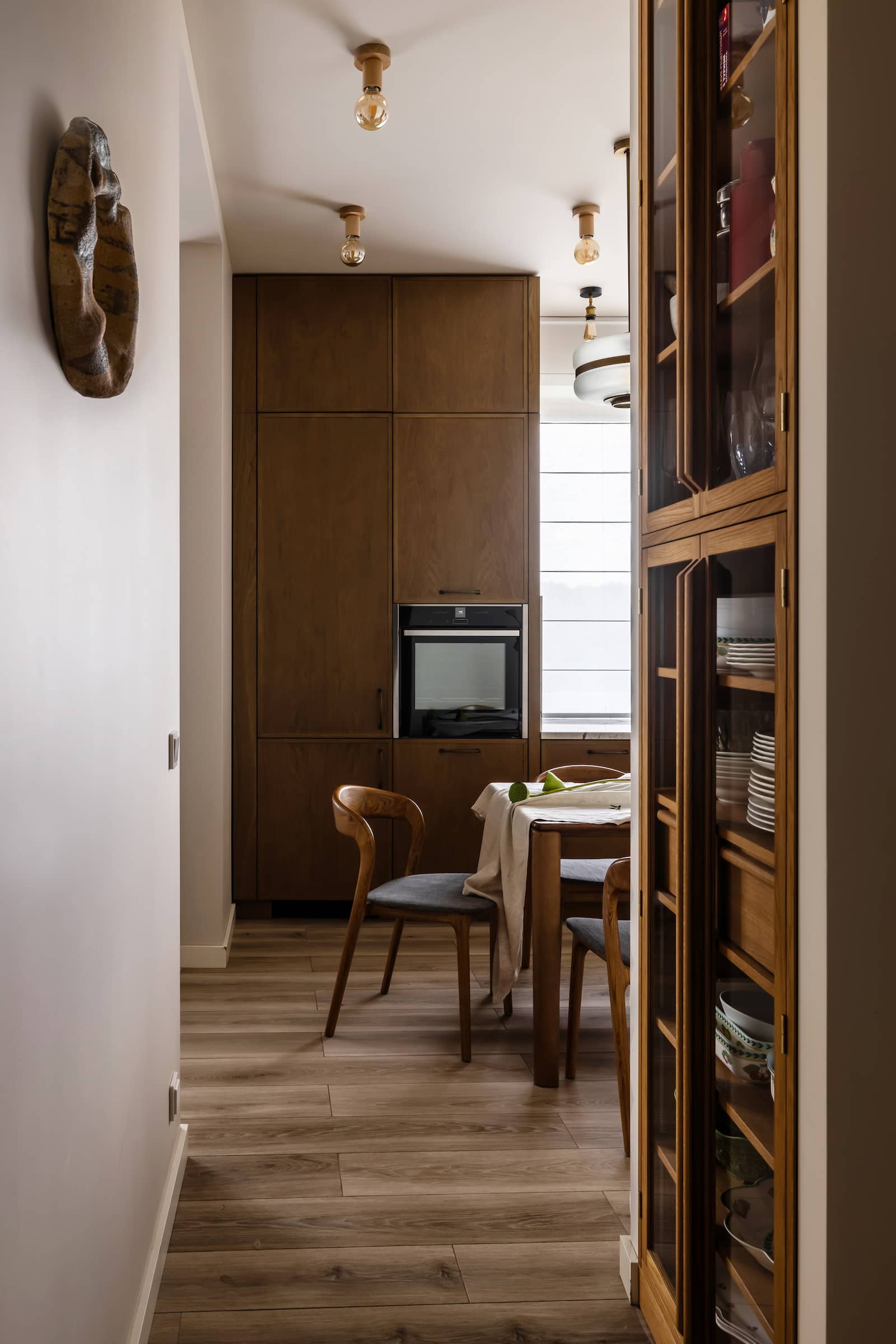 Прикроватные тумбочки, комод под телевизором, зеркала — все имеет обтекаемые формы, что соответствует задумке сделать визуально «мягкий» интерьер. Буфет с подсветкой для коллекции глиняной посуды хозяйки удачно встроен у входа в кухню-столовую. Уникальный рисунок и оттенок орехового шпона был использован для фасадов встроенных шкафов во всей квартире.