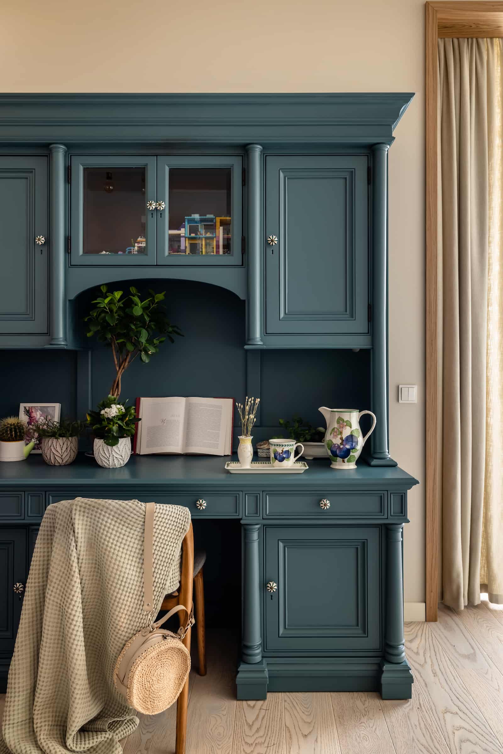 Самый необычный предмет в интерьере — это отреставрированное трюмо в детской комнате, доставшееся от предыдущих хозяев. Решено было его оставить и дать ему вторую молодость. Мы выкрасили его в изумрудный оттенок и добавили керамические индийские ручки.